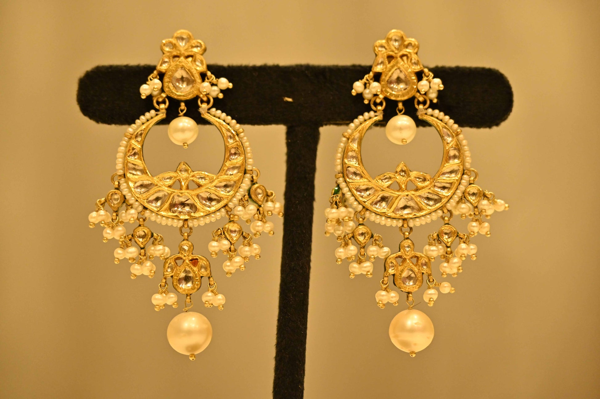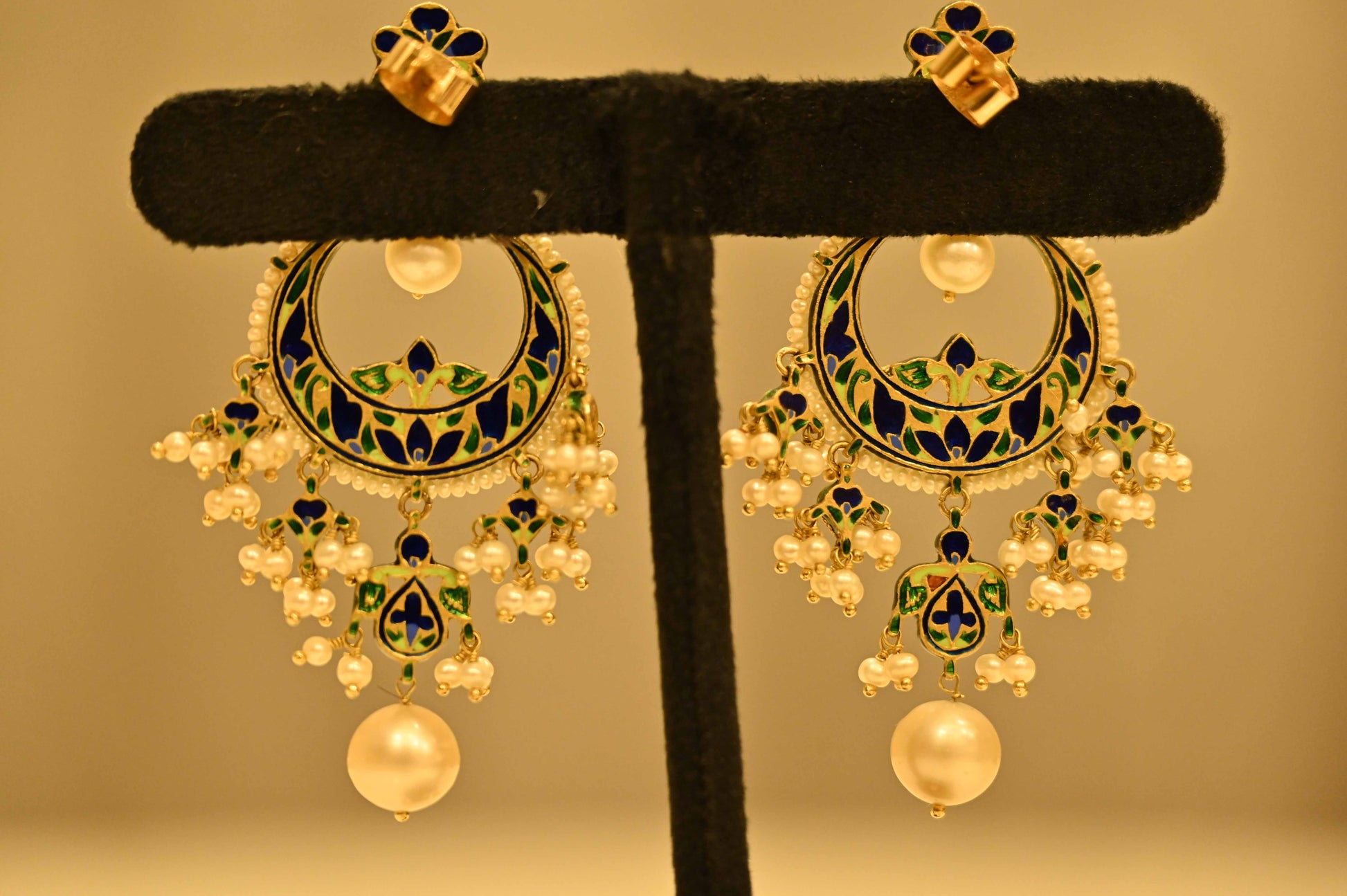 Indulge in opulent elegance with our 22K Pearl Chaandbali earrings adorned with sparkling diamond polki, Pearls and exquisite enamel detailing on the back. Effortlessly blending traditional charm with modern sophistication, these earrings are a timeless statement of luxury. Explore now for unparalleled beauty.