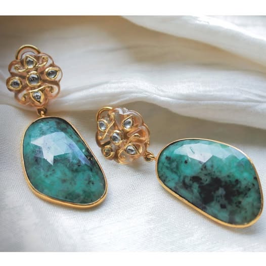 Set in rich 18K gold-plating, the hand-cut emerald-hued stones shimmer with natural depth, crowned by a Mughal-inspired floral stud adorned with uncut polki diamonds. The contrast of organic green and intricate goldwork makes them the kind of piece that refuses to be ignored.