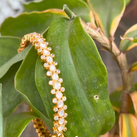 The Auric Dewdrop Bangle is more than an accessory—it’s a signature. A line of perfectly cut dewdrop stones sits in a warm, handcrafted gold setting, creating a soft shimmer that moves like liquid light across your wrist. Each gem sits snugly in a symmetrical halo, giving the bangle a refined structure while keeping its delicate, ethereal beauty intact.