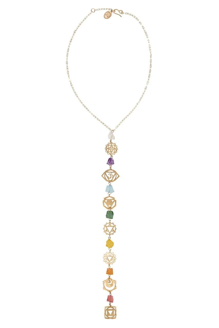A breathtaking tribute to your inner cosmos, the Chakra Line Necklace channels the energy flow of the seven chakras through a stunning vertical cascade of sacred geometry and natural gemstones.