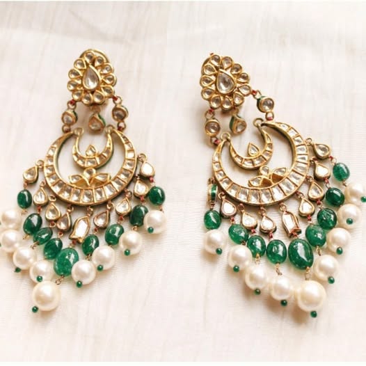 Twin crescent moons (chand) form the heart of each earring—layered with delicate uncut Polki diamonds and framed in high-polish gold. Suspended below are tiers of tear-shaped kundan drops, crowned with alternating strings of luminous pearls and emerald green beads—reminiscent of royal jharokhas adorned with silken drapes and gem-studded lamps.