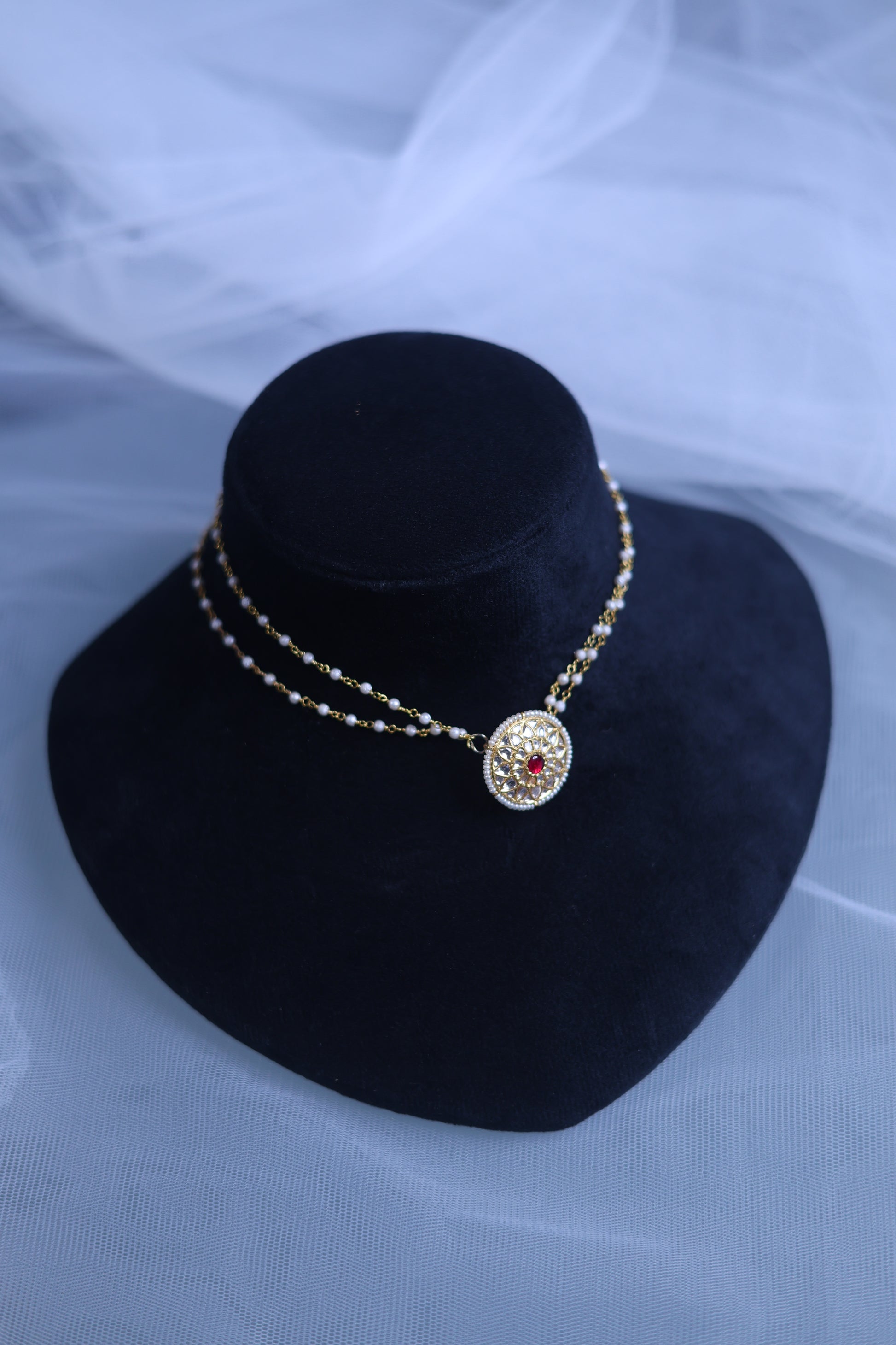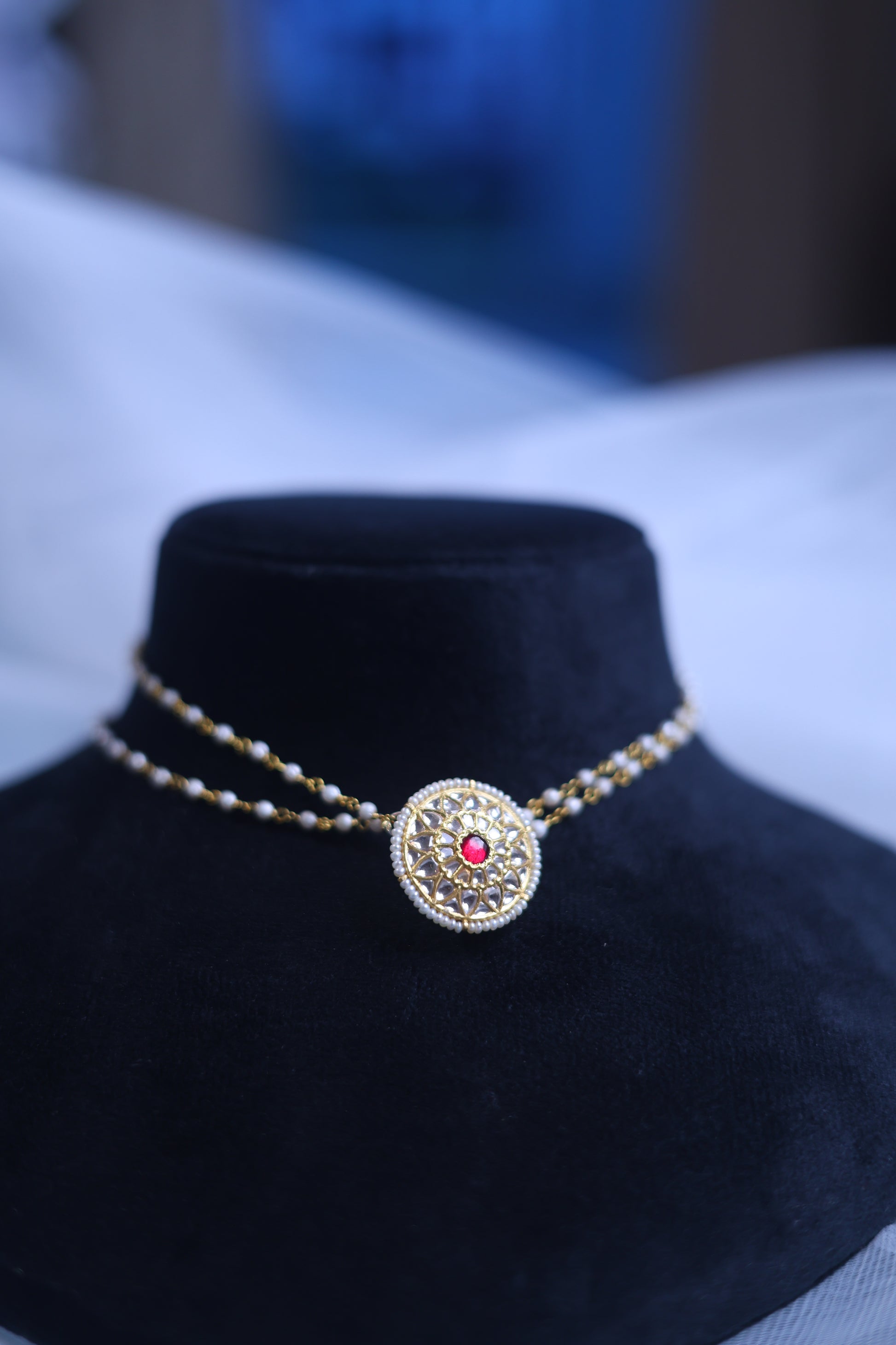 A classic headpiece, traditionally called as Bor made in 22K goldwith Diamond polkis and ruby adding to the glam at the center