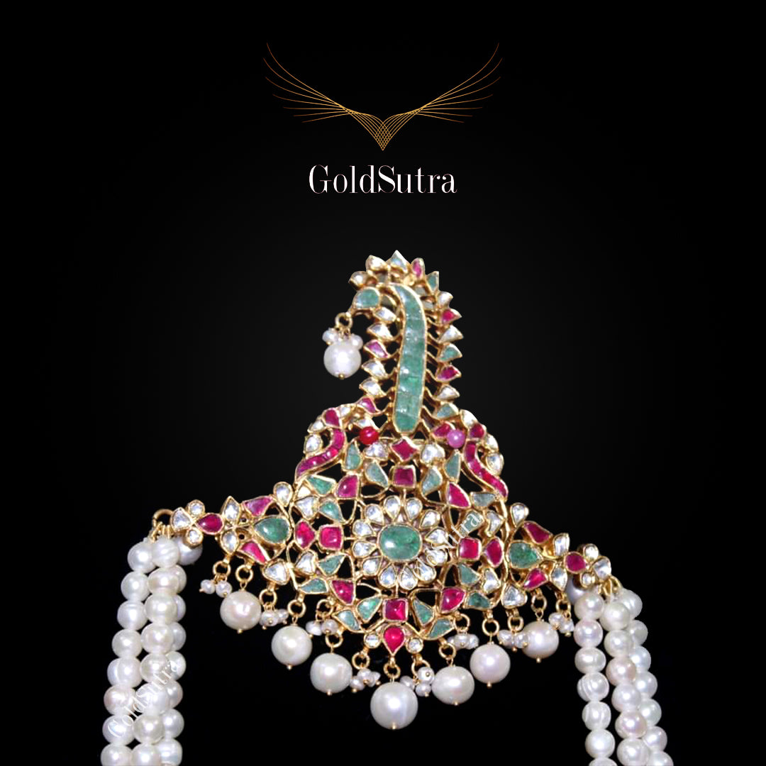 Our handcrafted 18K Kundan Jadau Kilangi, adorned with vibrant rubies, emeralds, and delicate pearl strings, is the epitome of sophistication for the modern Indian groom. This exquisite headwear blends timeless artistry with luxurious design, making it a standout accessory for weddings and traditional ceremonies. Elevate your wedding look with this statement Kilangi, crafted to exude royal charm and unmatched elegance