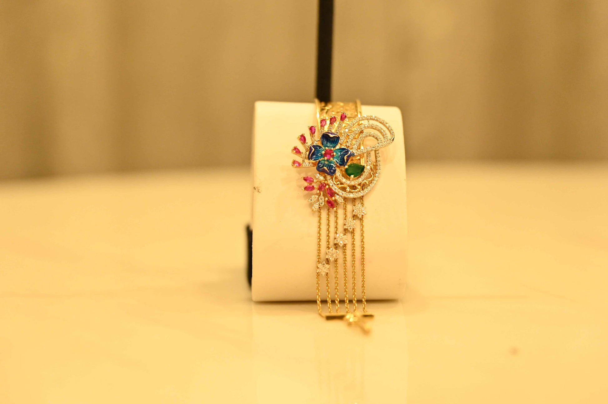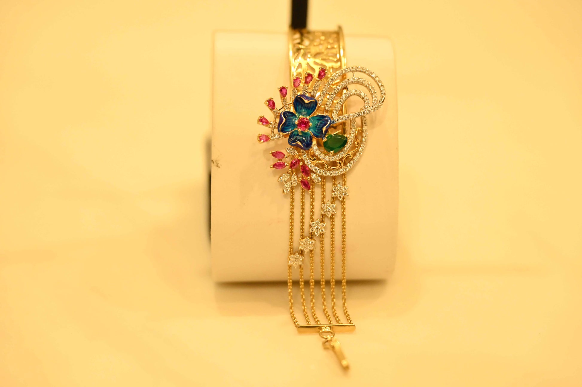 Elevate your wrist with our exquisite Diamond, Ruby, Emerald, and Blue Enamel Gold Bracelet. Crafted to perfection, this stunning piece combines the brilliance of diamonds with the rich hues of rubies, emeralds, and captivating blue enamel. Experience the epitome of luxury and sophistication with this statement bracelet that adds a touch of elegance to any ensemble.