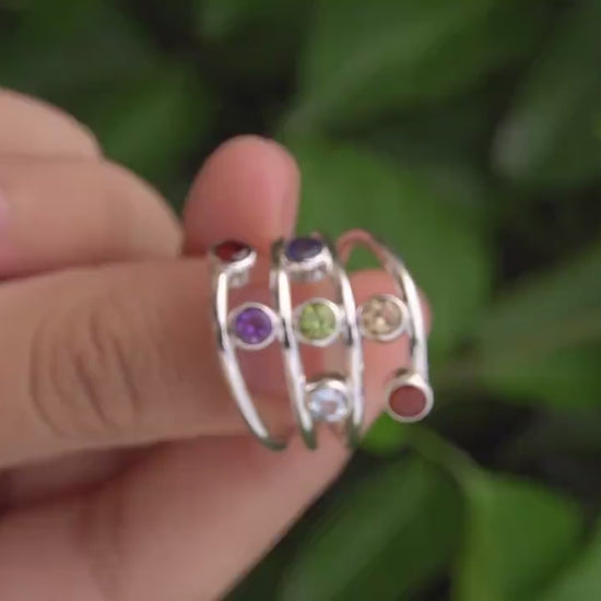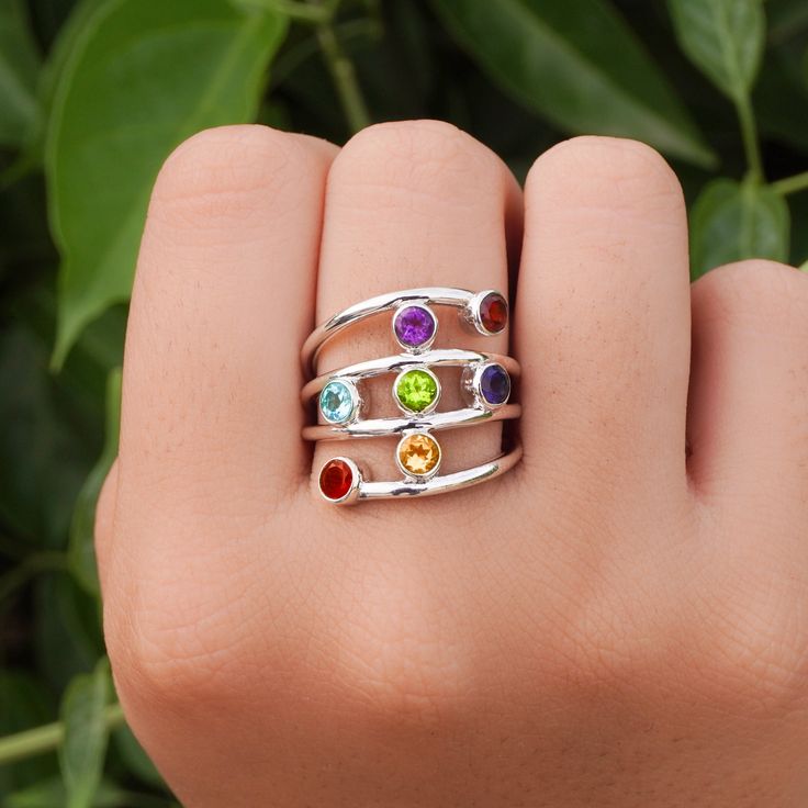 Handcrafted in luxurious 14K white gold, this vibrant ring features seven genuine, faceted gemstones β each thoughtfully chosen to represent a chakra energy center in the body: