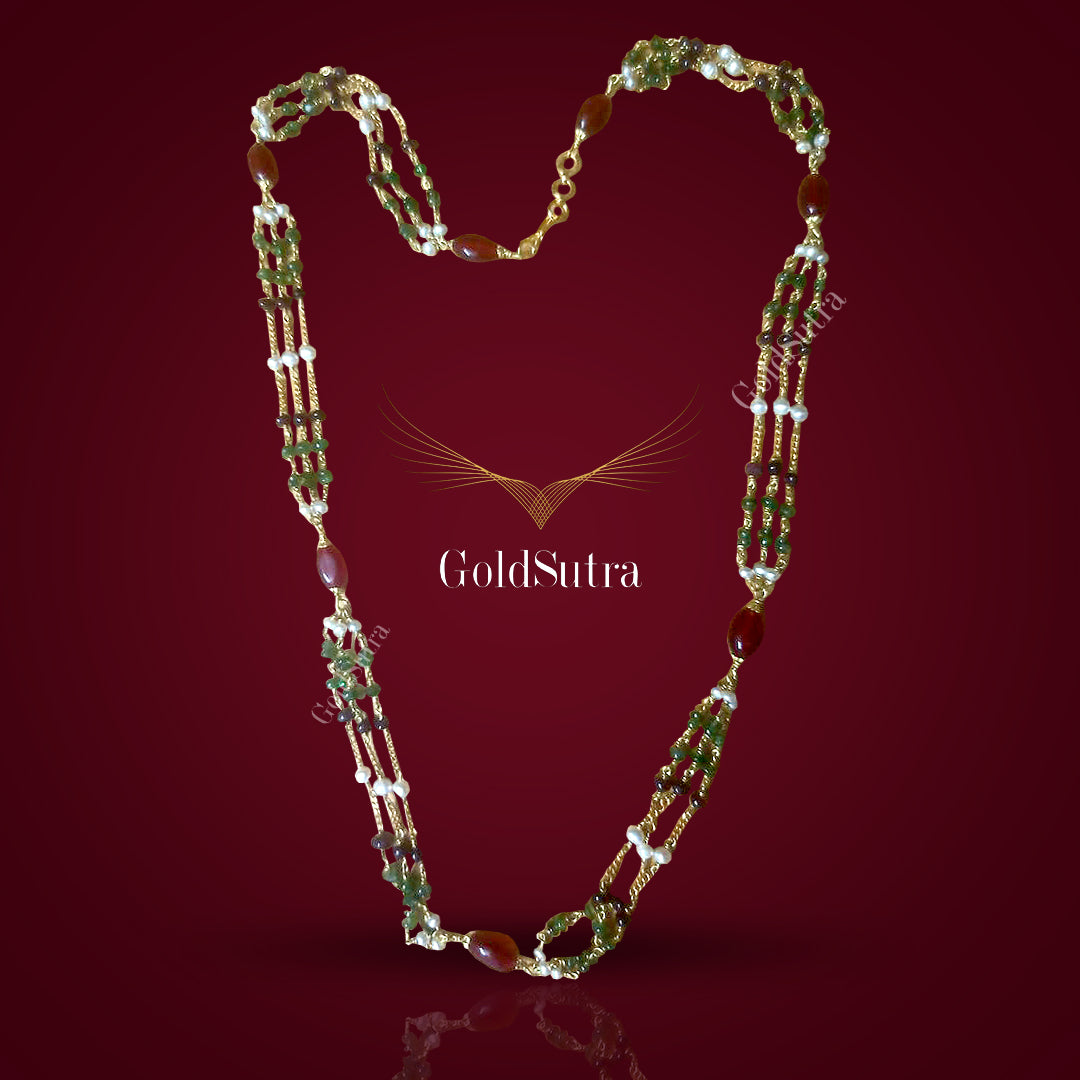 Our handcrafted 22k gold necklaces,adorned with rarerest of rare gemstones from the City of Nizams. Whether treating yourself or a loved one, these treasures are more than jewellery—they're timeless pieces of personal elegance and style.