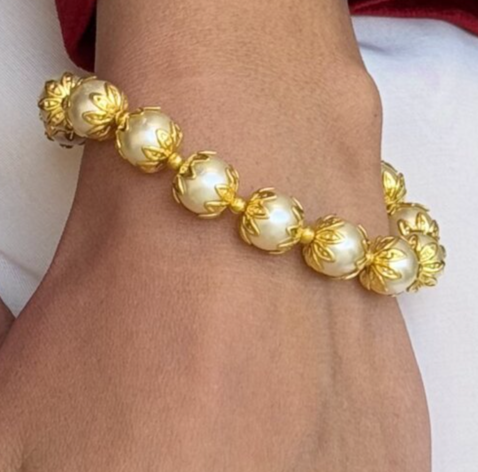 Handcrafted in a silver alloy with radiant gold plating, each faux pearl is framed in an intricate lotus-like gold cap, offering a unique blend of tradition and trend. It comes with a secure hook closure for a perfect fit – wherever you wear it.