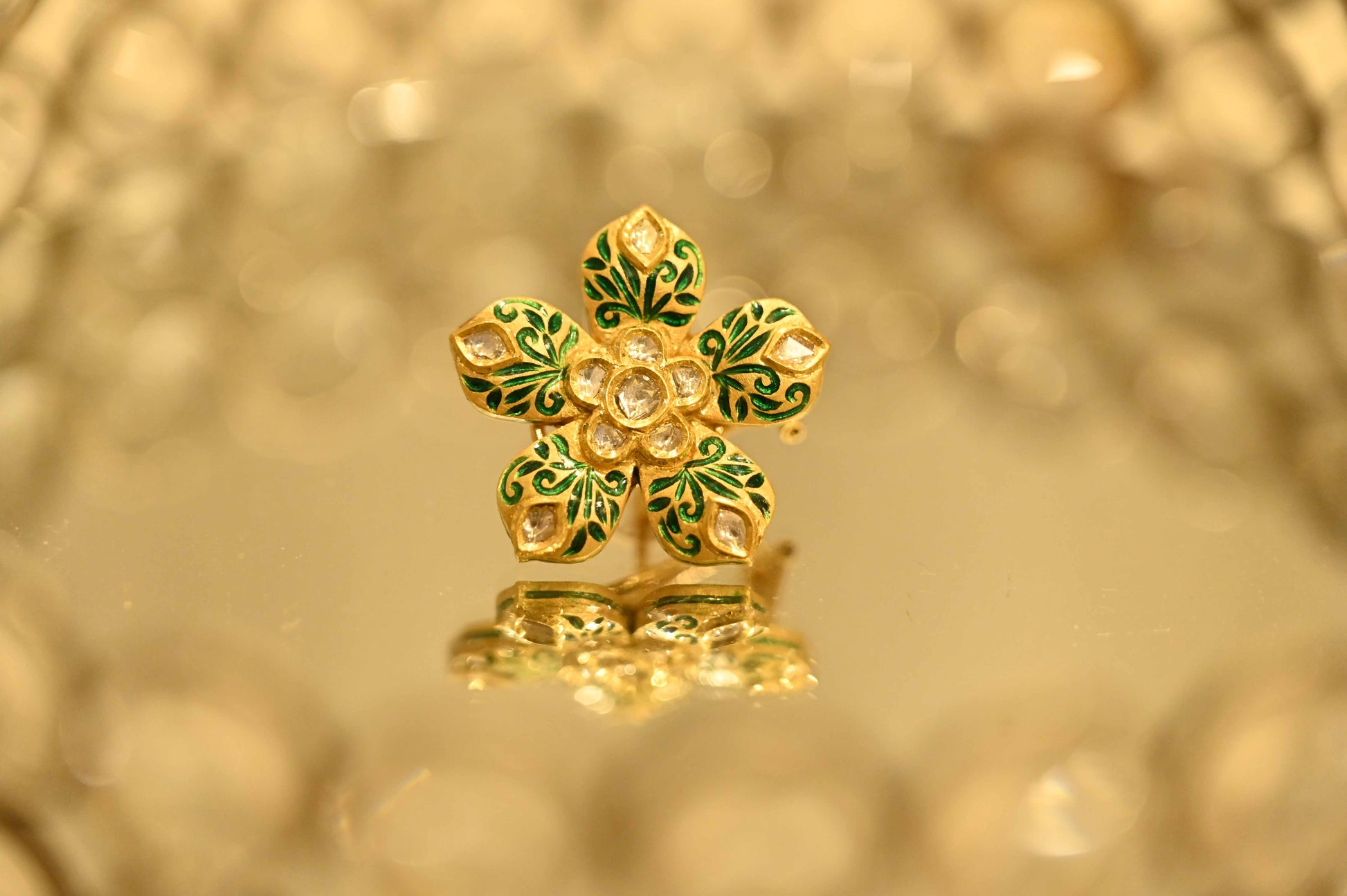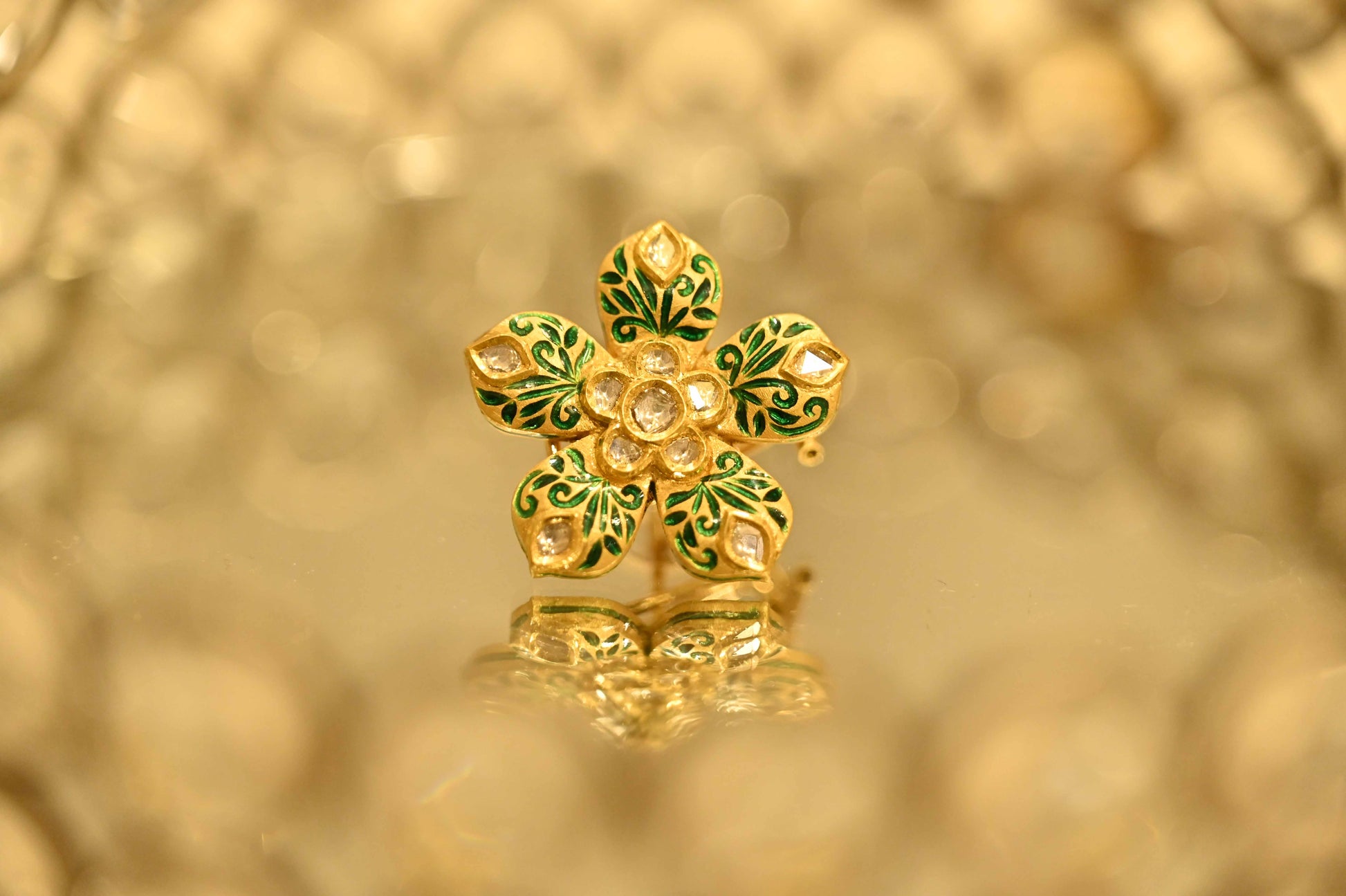 22K Gold ring with green enameling and diamond polki jadai. Best paired with matching set of earrings available with us.