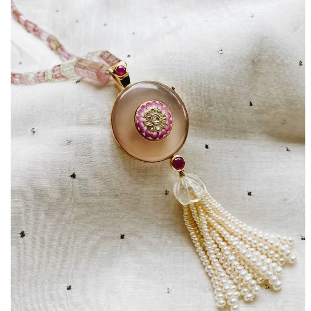The soft blush tones of the beads and the shimmer of pearls create a harmony between power and grace, making this piece a statement of elegance for women who command respect with quiet confidence.