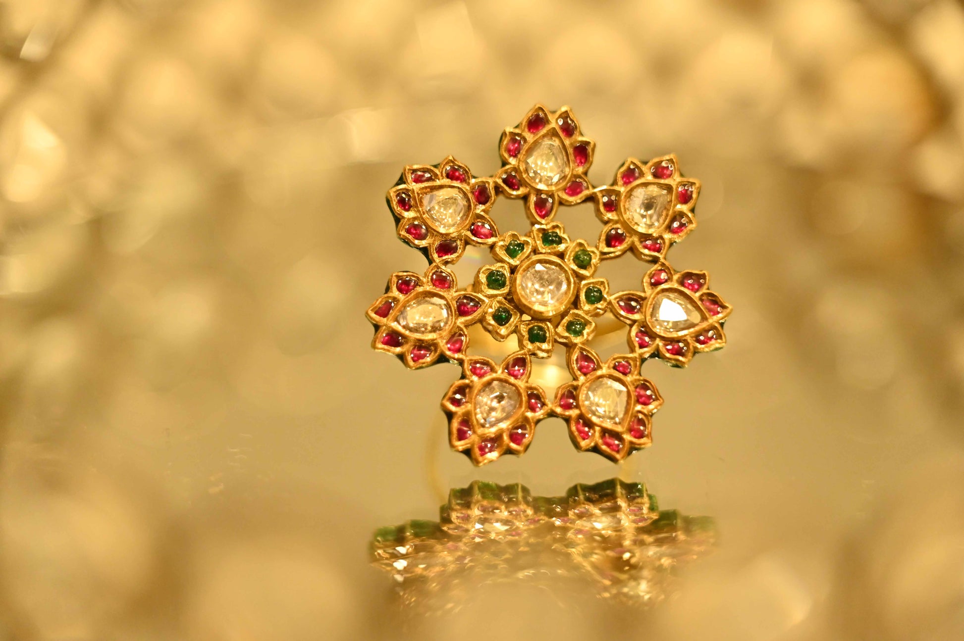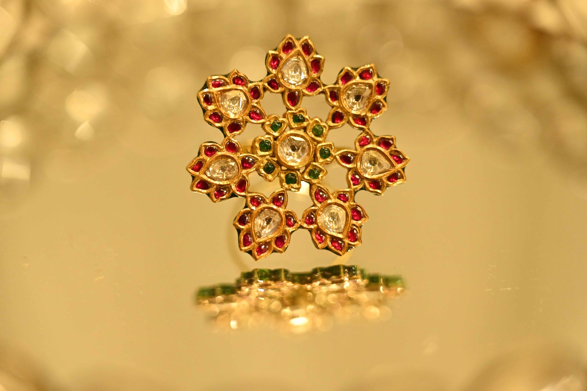Meticulously crafted to perfection, this exquisite piece showcases the timeless allure of Kundan work, complemented by the vibrant hues of rubies and emeralds, and the brilliance of diamond polki. Elevate your style with this statement ring, a testament to opulence and elegance.
