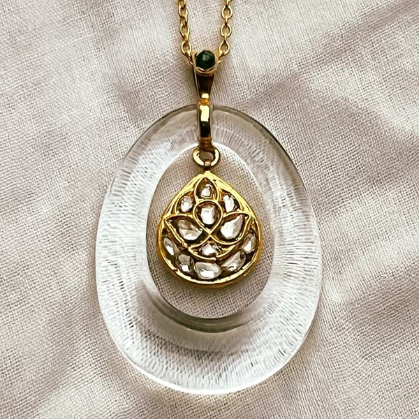 Framed in a sleek rock crystal oval, this piece cradles a kundan-set floral motif crafted in rich gold. The inverted lotus design nods to the ornamental vocabulary of Mughal art, reimagined for your daily wear. It's more than jewellery — it's heritage you can wear on a coffee run or to cocktails.