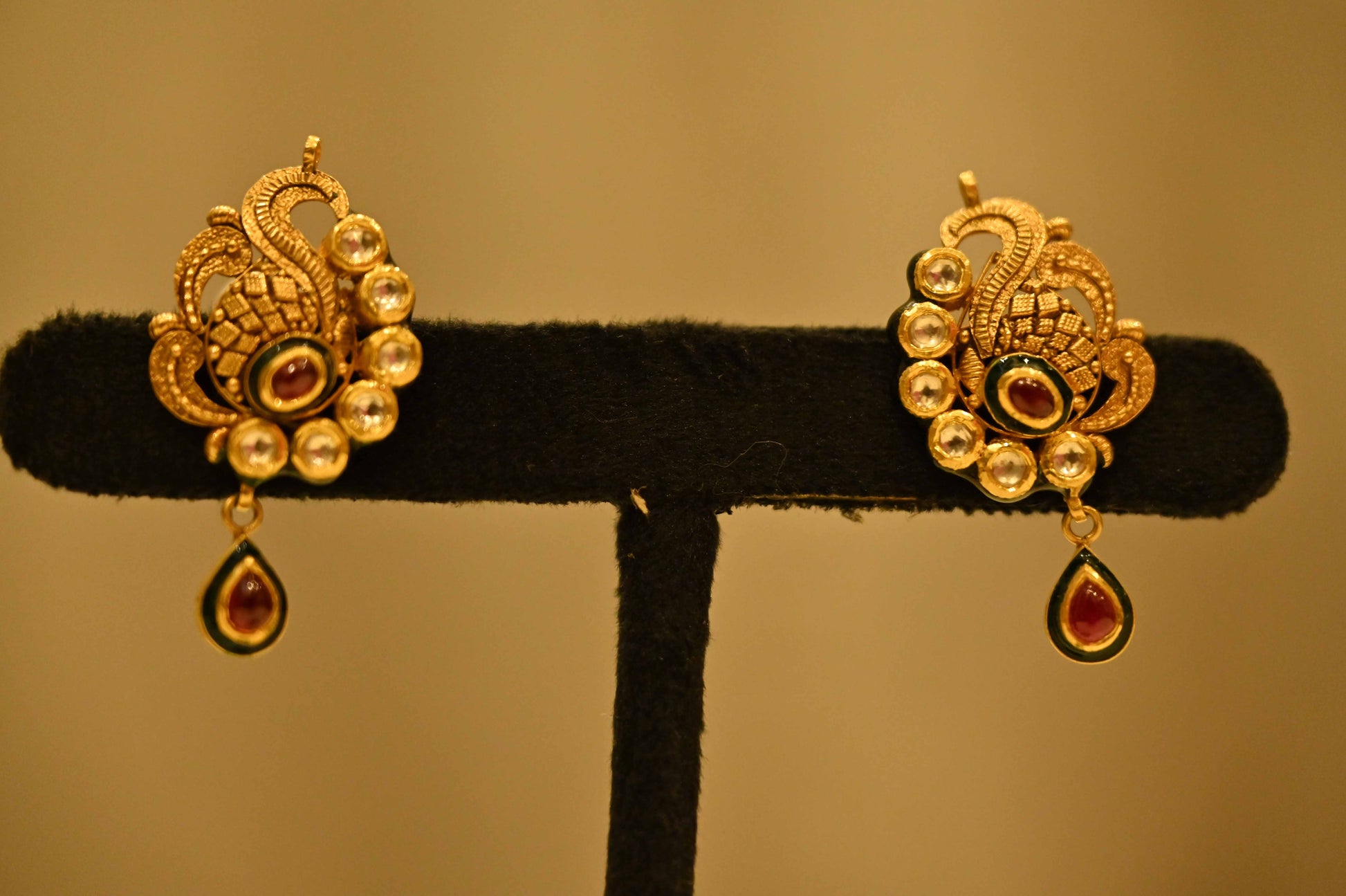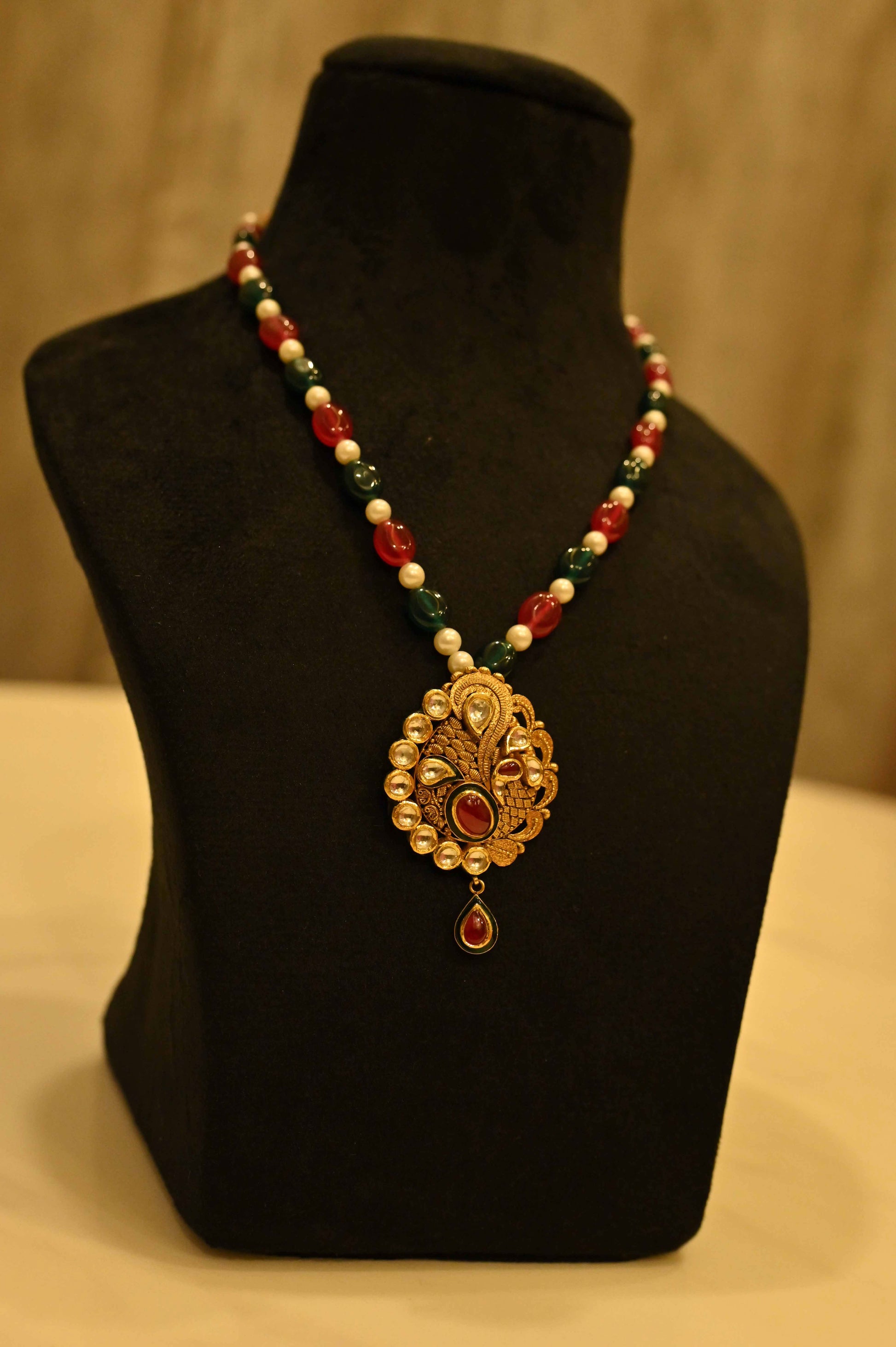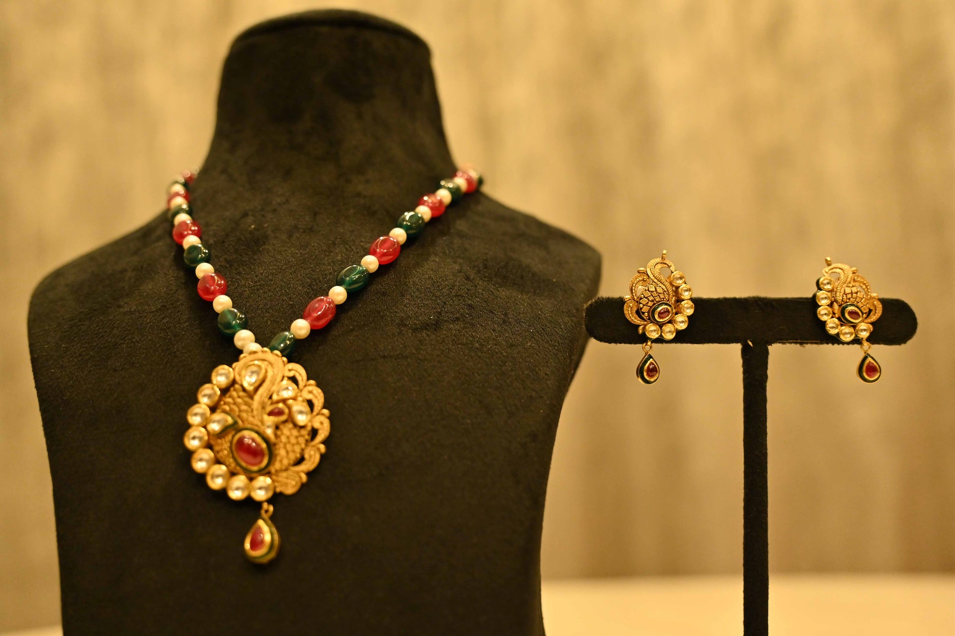 An elaborately handcrafted necklace made in 22K fine gold with uncut imitation polkis and Ruby. Comes with a pair of matching earrings