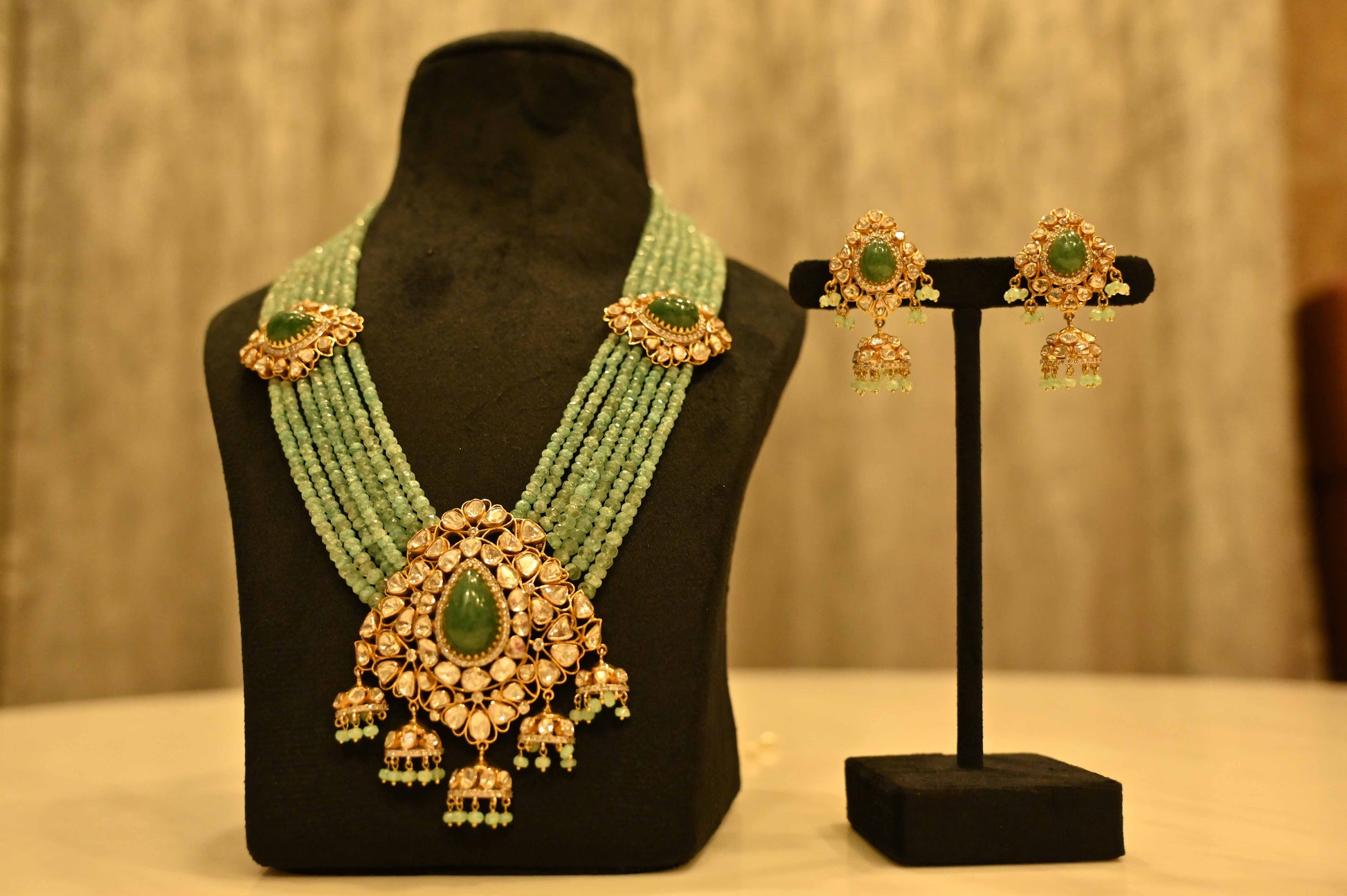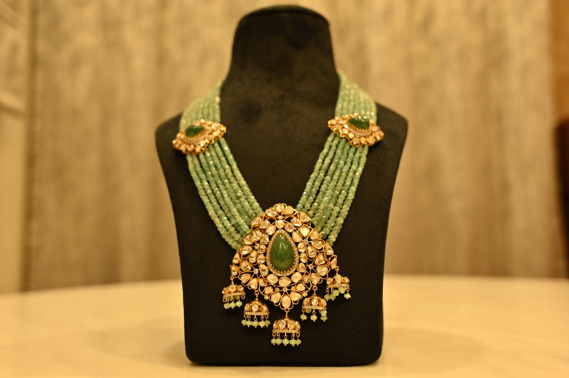An elaborately handcrafted necklace made in 14K fine gold and uncut diamond polkis, with precious emeralds. The string is made with semi precious beads. Comes with a pair of matching earrings