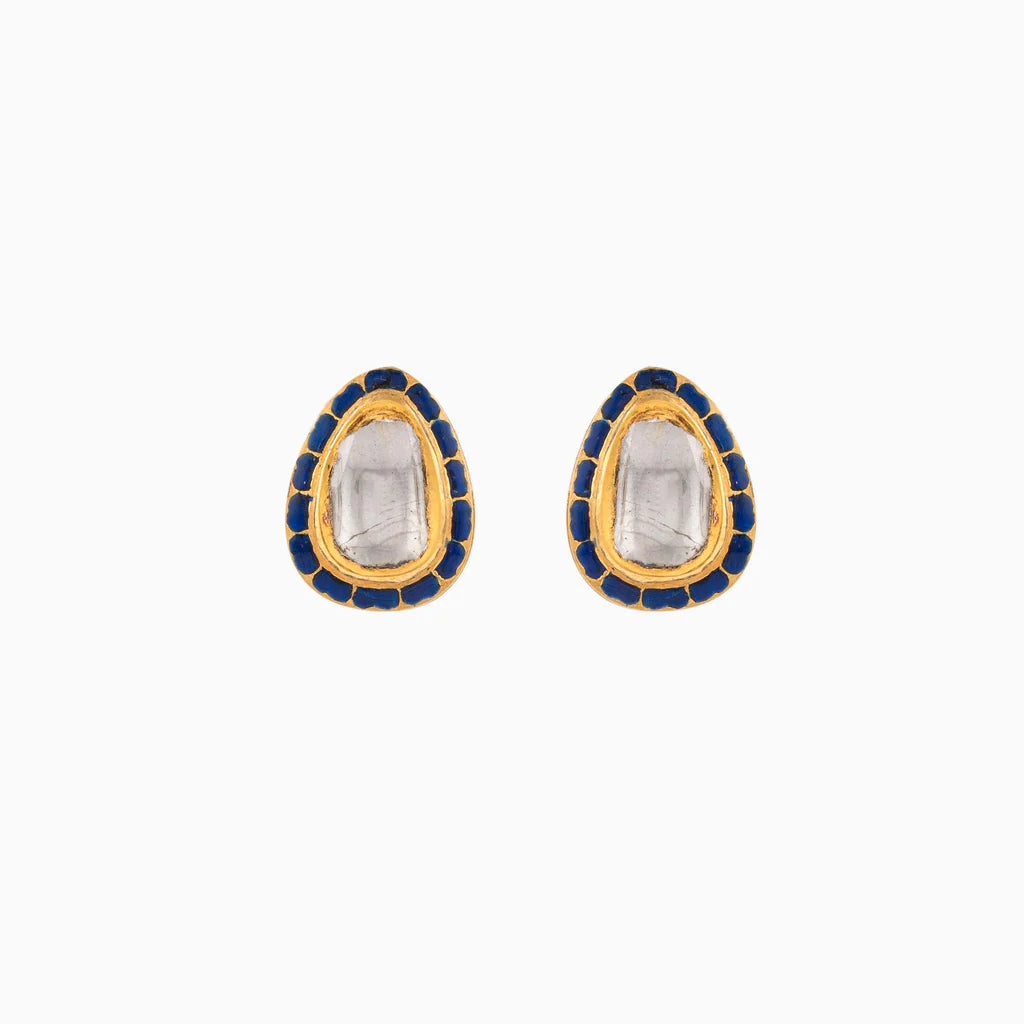 Step into a world of legacy and regal allure with these stunning Jadau earrings, handcrafted in pure 22K gold. Adorned with a luminous single uncut diamond Polki at the centre and detailed with rich blue enamel Meenakari (Meena) work on the reverse, this pair is a tribute to centuries-old craftsmanship from the royal ateliers of Rajasthan.