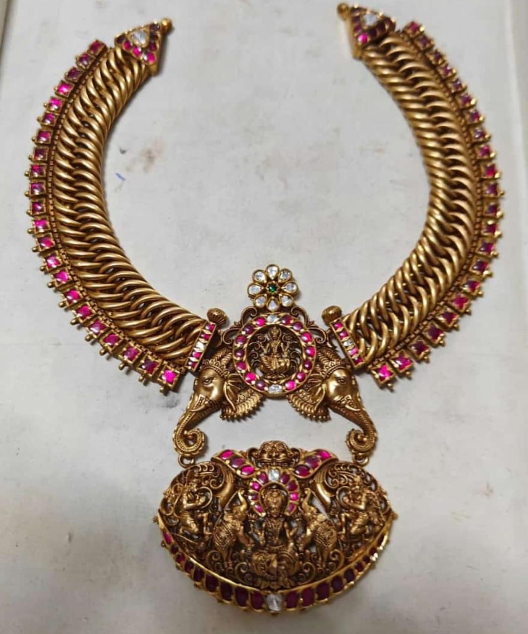 Mehraab Gulhaar Necklace is a masterpiece in antique gold tones, brought to life with intricate peacock motifs, emerald inlays, and rows of pearls that speak of devotion and feminine resilience. The bold centre medallion narrates stories of regality, while hand-etched designs across the surface lend this haar an heirloom-like charm.