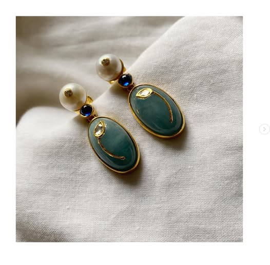 This pair draws directly from Mughal architecture’s flowing arches and botanical details — reimagined with a soft, minimalist lens. The top is a flawless freshwater pearl, set with a tiny diamond. It leads into a midnight blue sapphire bezel and finishes in an elongated cabochon of Green Aventurine, delicately inlaid with kundan-style uncut diamond vines. Every element is precious. Every inch is hand-finished.