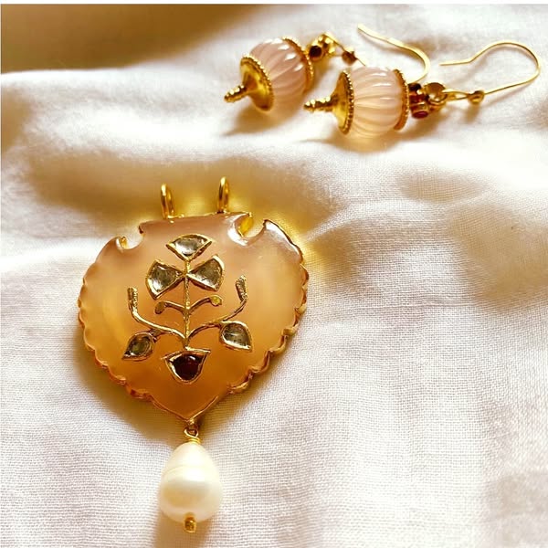 Inspired by Mughal jharokhas and garden motifs, the pendant features a delicately carved blush chalcedony base, framed in gold with intricate kundan-set floral inlay, finished with a luminous natural pearl drop. Paired with its perfectly matched earrings, carved from rose quartz and crowned in gold, this set is a quiet celebration of old-world beauty — with a new-age edge.
