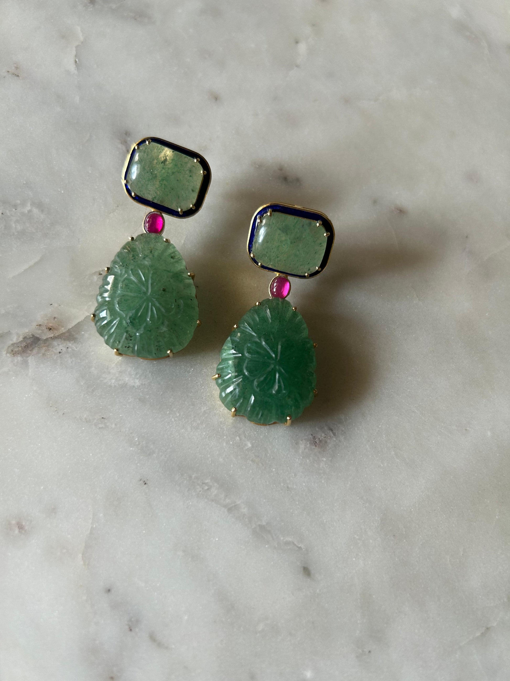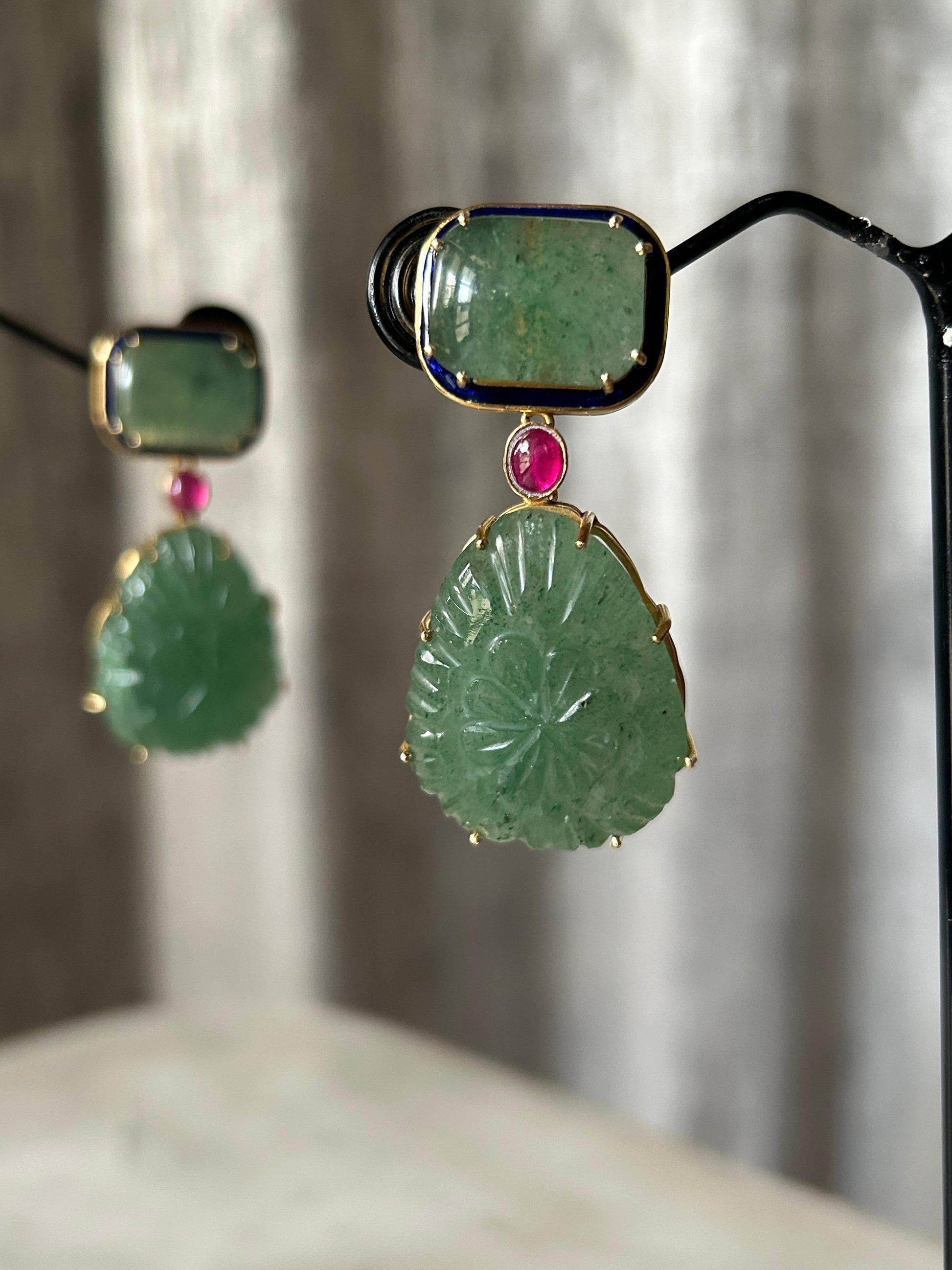 A serene tribute to the symmetrical beauty of Mughal gardens, the Nargis Phool Baalis feature hand-carved green gemstones resembling nargis blooms, delicately linked with ruby drops and set beneath enamel-finished studs. Their floral symmetry whispers of tradition, while their form speaks to clarity and control.