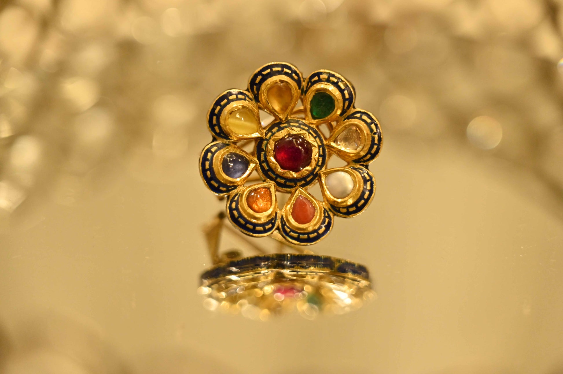 22K Gold Ring with blue enameling and navratna jadai. Best paired with matching set of earrings available with us.