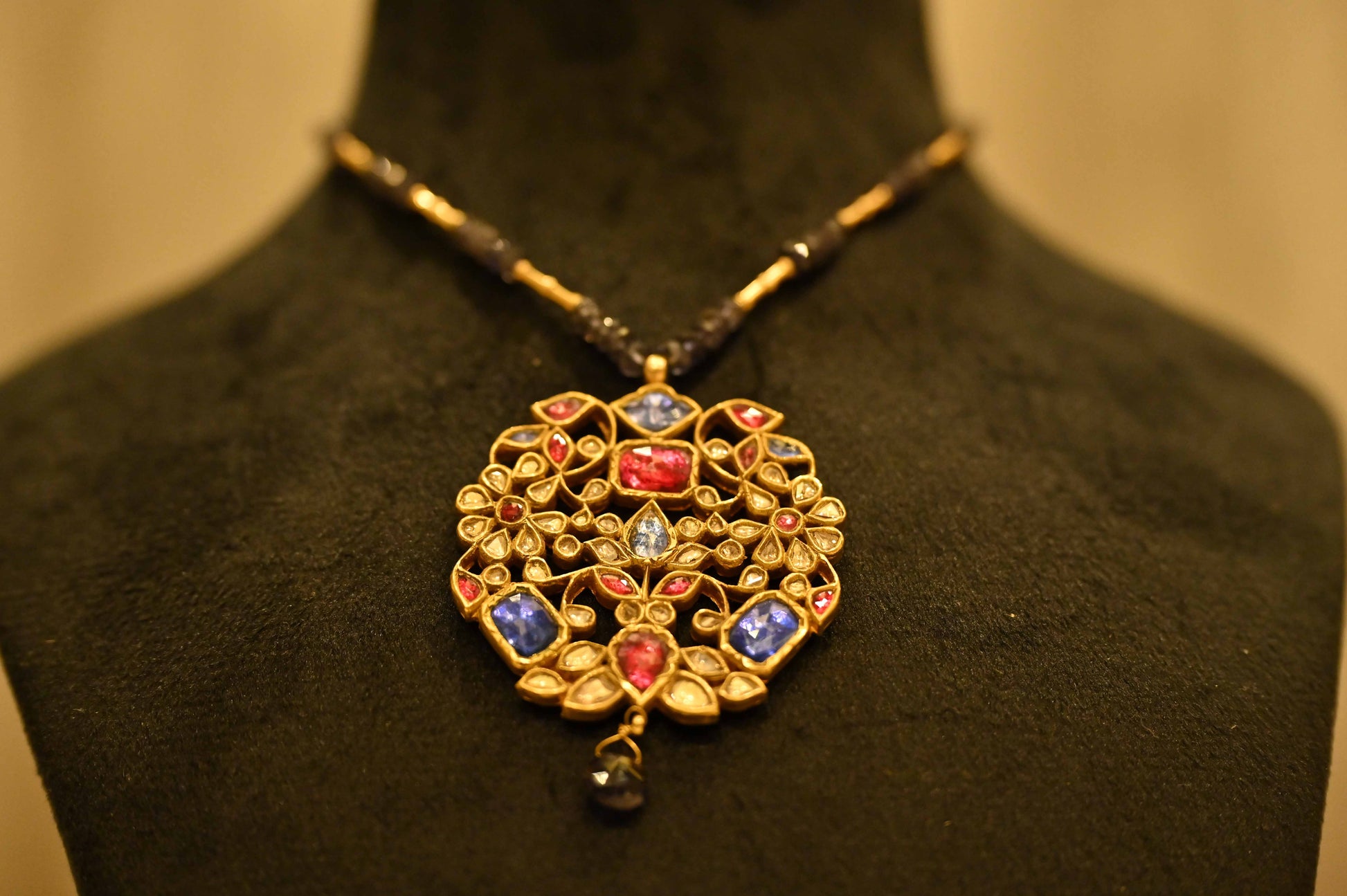 An elaborately handcrafted necklace made in 18K fine gold with uncut diamond polkis, rubies and sapphire. Comes with a pair of matching earrings