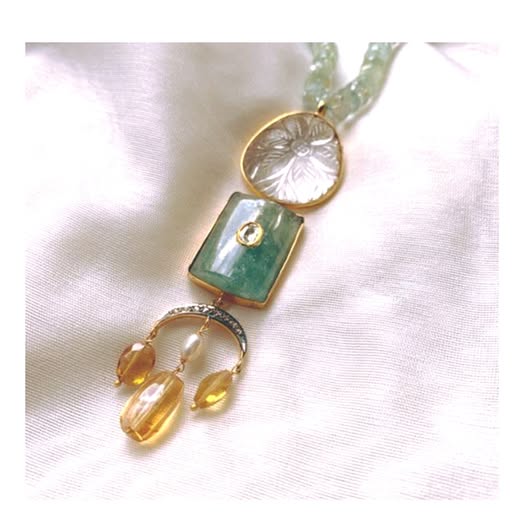 From GoldSutra’s Mughal Chic Collection, the Noor-e-Bahar – Celestial Garden Pendant is a poetic fusion of artistry and symbolism. Suspended from a string of delicate aquamarine-hued beads, the pendant unfolds in three enchanting tiers. At the crown lies a luminous, hand-carved rock crystal disc, etched with a floral motif—a nod to Mughal gardens and the eternal bloom of femininity. Beneath it rests a rich green rectangular stone, set with a single uncut Polki diamond, embodying growth, renewal, and the steadfast strength of nature. The composition flows into a crescent of diamonds from which three golden citrine drops sway like sunlit blossoms in a gentle breeze.