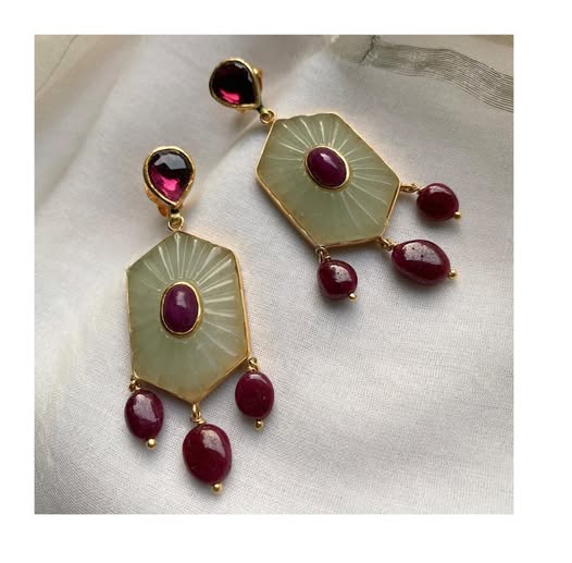 With geometry and grace woven into every curve, the Noor Jahan Baalis are a portrait of controlled opulence. Intricately carved green jade panels fan outward like the sun, while cabochon rubies drop like secrets passed between queens. Light in weight, rich in story—these earrings are designed for the woman who listens more than she speaks and still commands the room.
