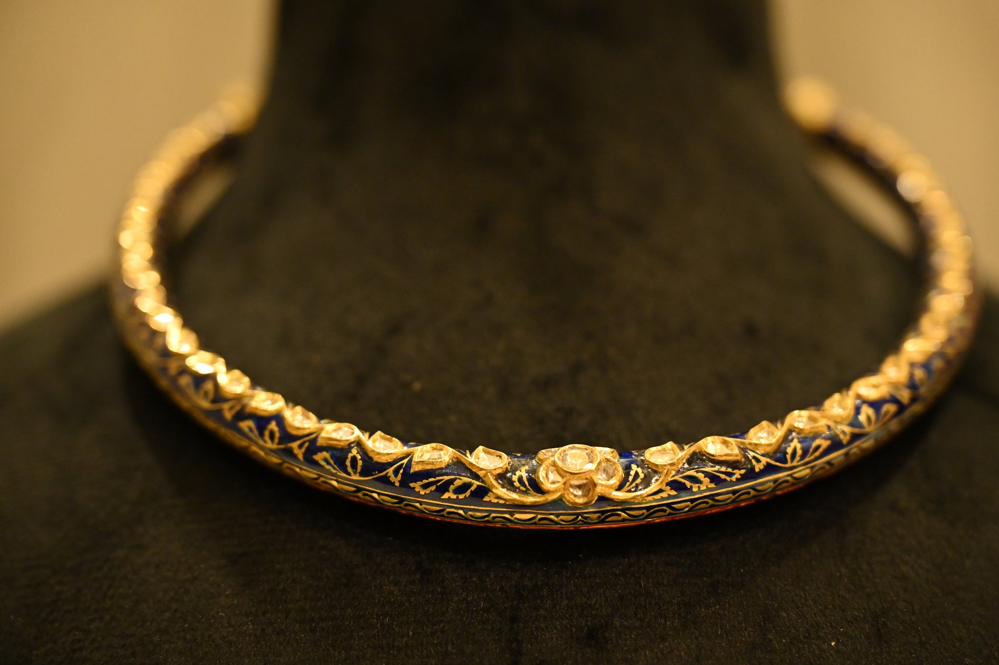 Celebrating the divine beauty of blue enameling and jadau hasli inspired by Rajasthan's Blue Pottery art.
