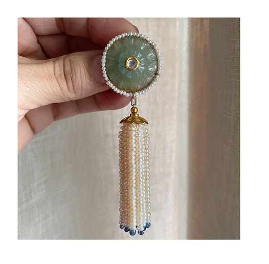 Inspired by the grandeur of Mughal domes and flower motifs, this earring features a hand-carved green aventurine floral disc, haloed in micro-pearls, with cascading tassels made of AAA-grade freshwater pearls, accented with blue chalcedony drops. Each detail whispers royalty, yet sings versatility.