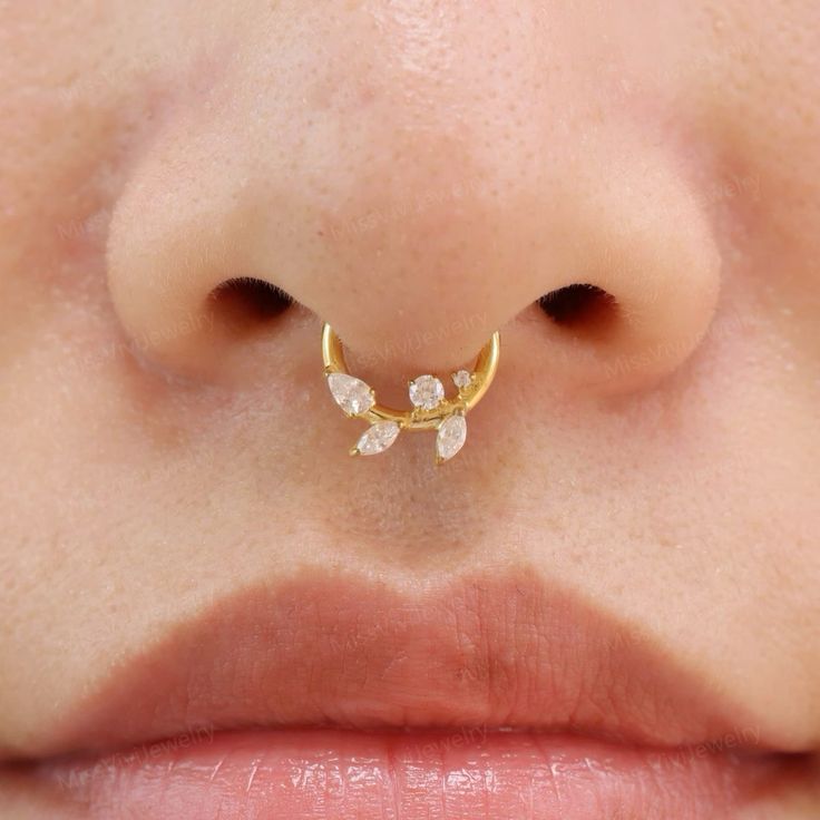 14K gold septum nosepin | Leaf design septum ring | Zircon diamond septum jewellery | GenZ gold nosepin | Stylish desi nose ring | Trendy gold septum for womenÂ