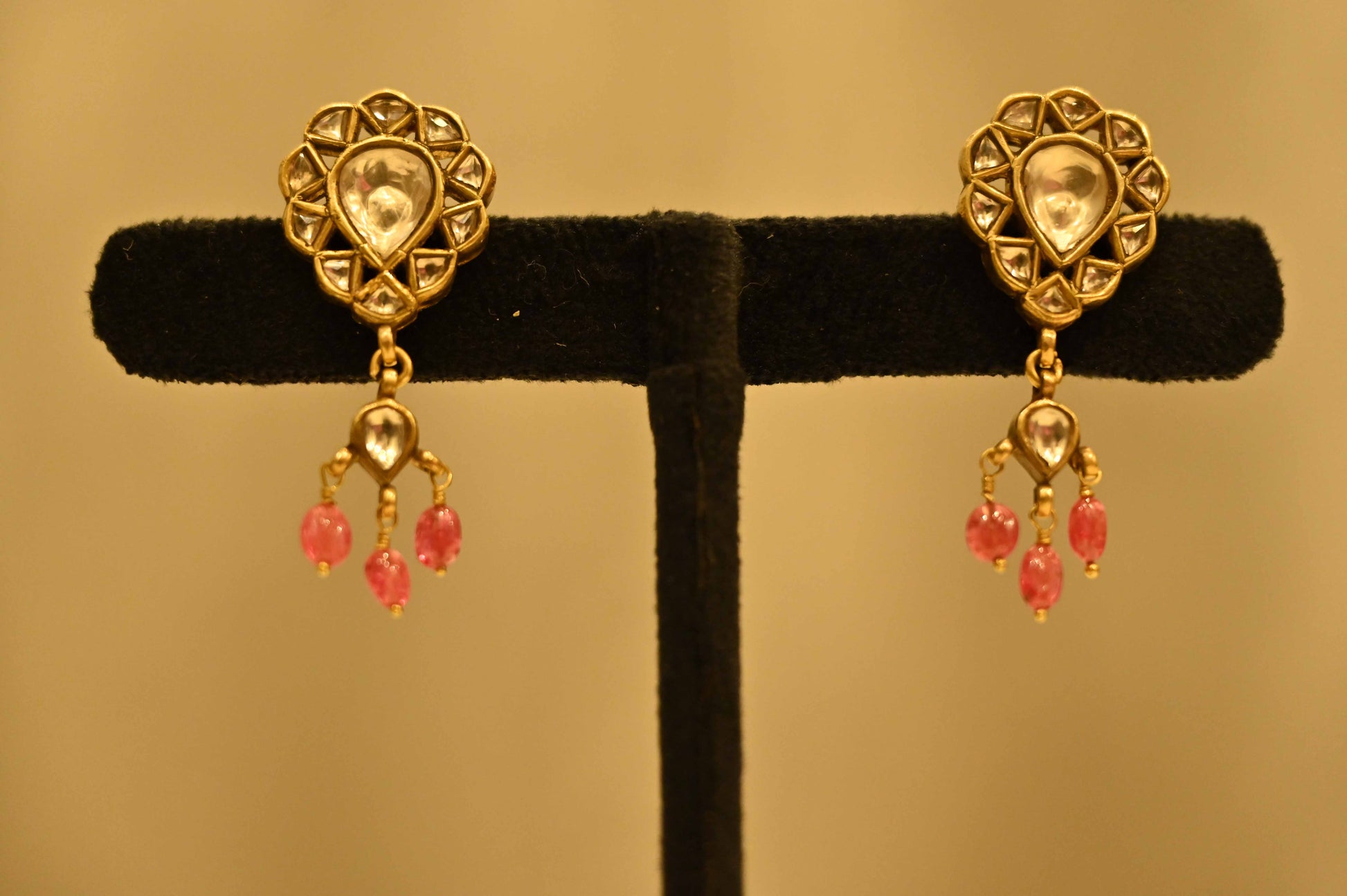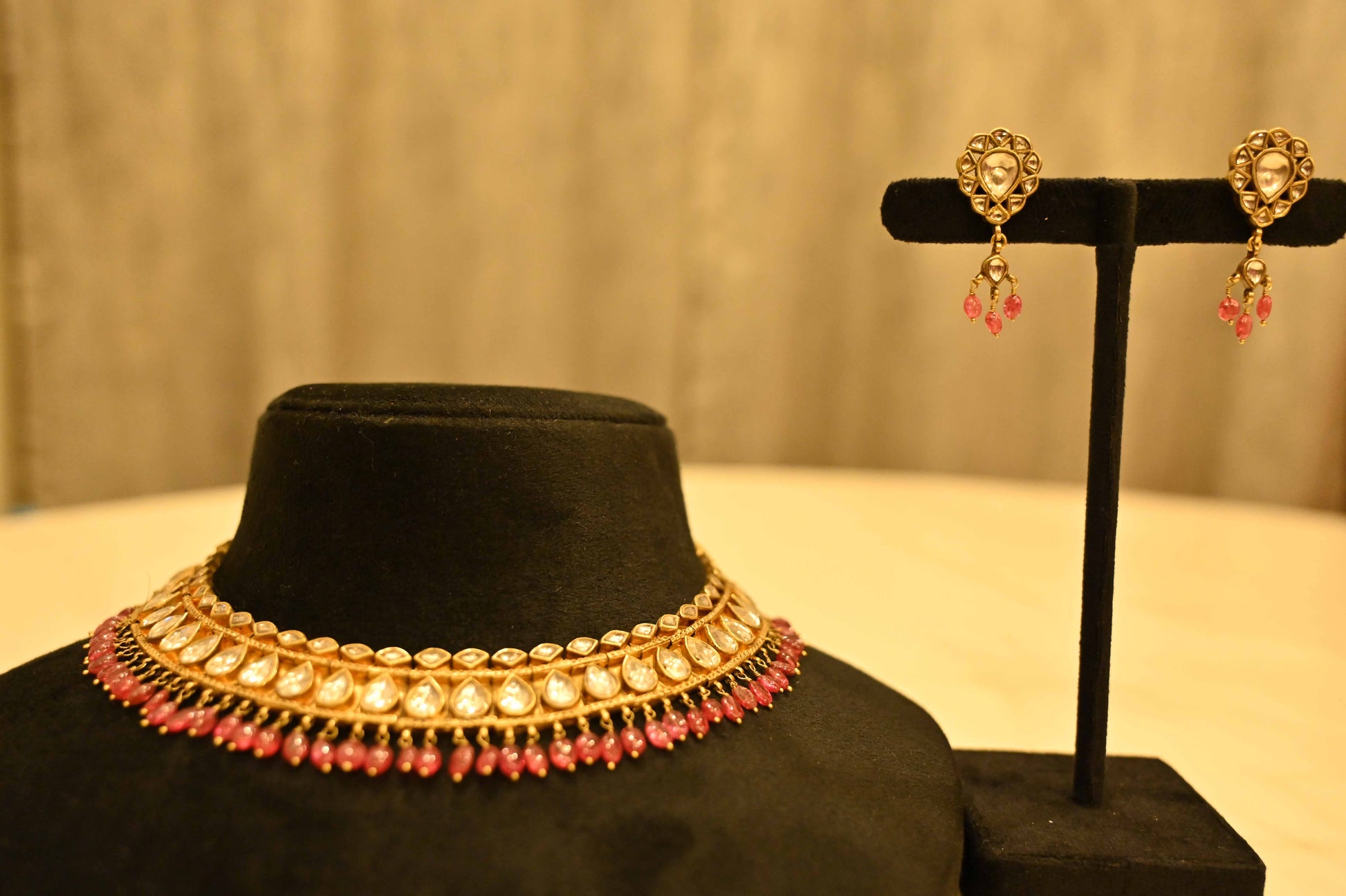 An elaborately handcrafted pipe puwai necklace made in 18K fine gold with imitation polkis and rubies. Comes with a pair of matching earrings