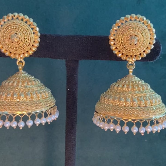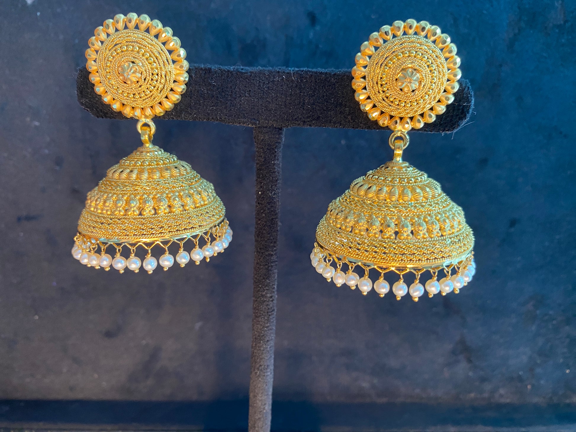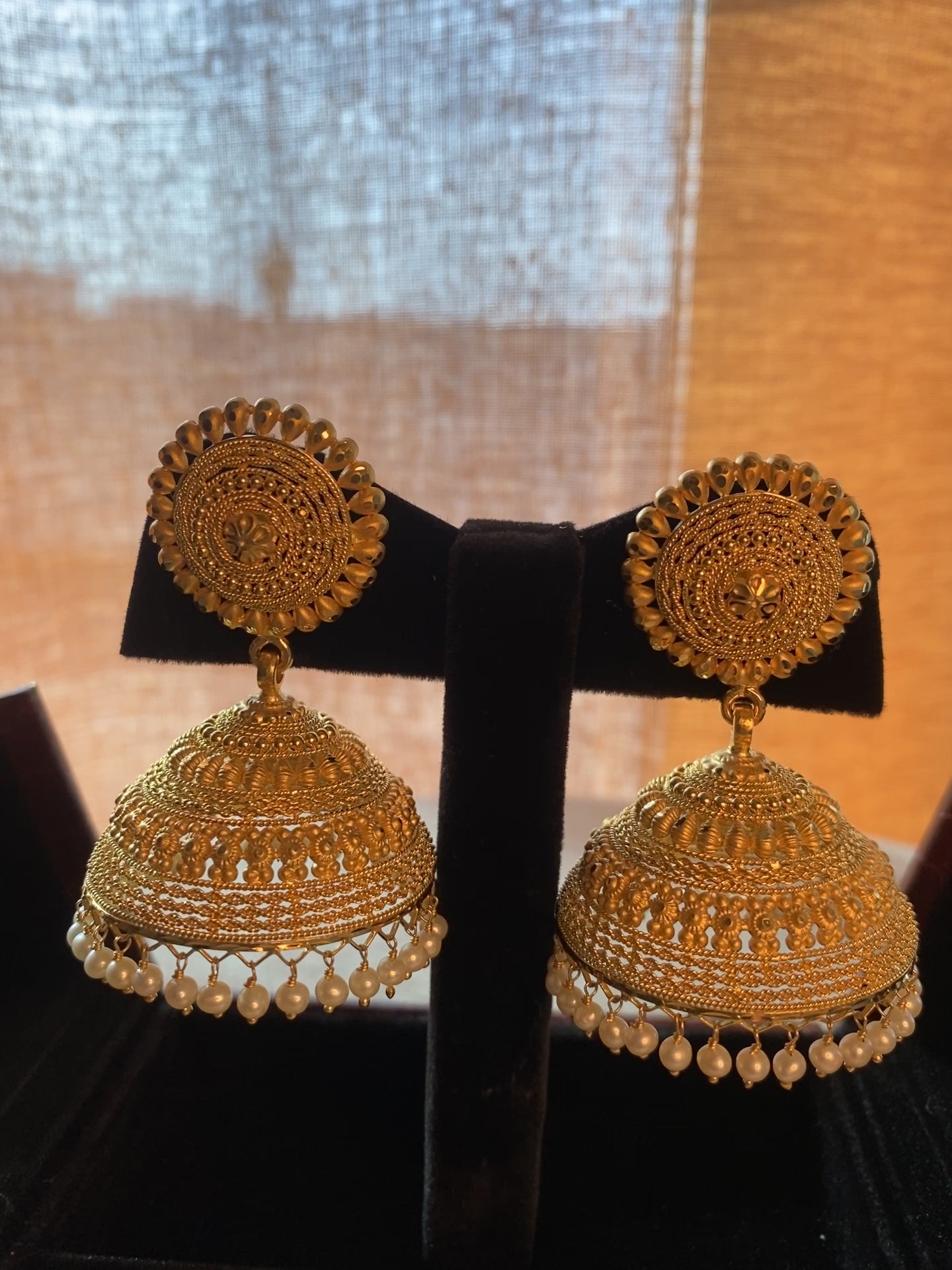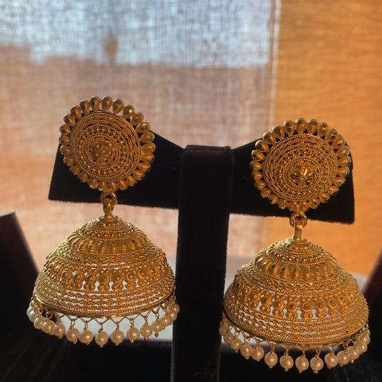 Elevate your style with our stunning 22K gold jhumkis, featuring a grand 1.5-inch diameter jhoomar design that exudes elegance and extravagance. Despite their opulent size, these beauties weigh just 35 grams, offering unmatched comfort without compromising on luxury.