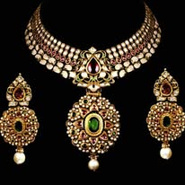 At the center: a lotus-shaped pendant, featuring a Colombian emerald, a halo of rose-cut diamonds, intricate meenakari work, and a finishing touch—a South Sea pearl that gently sways like royalty in motion.