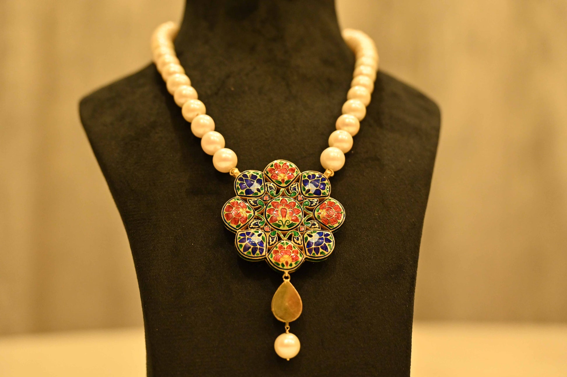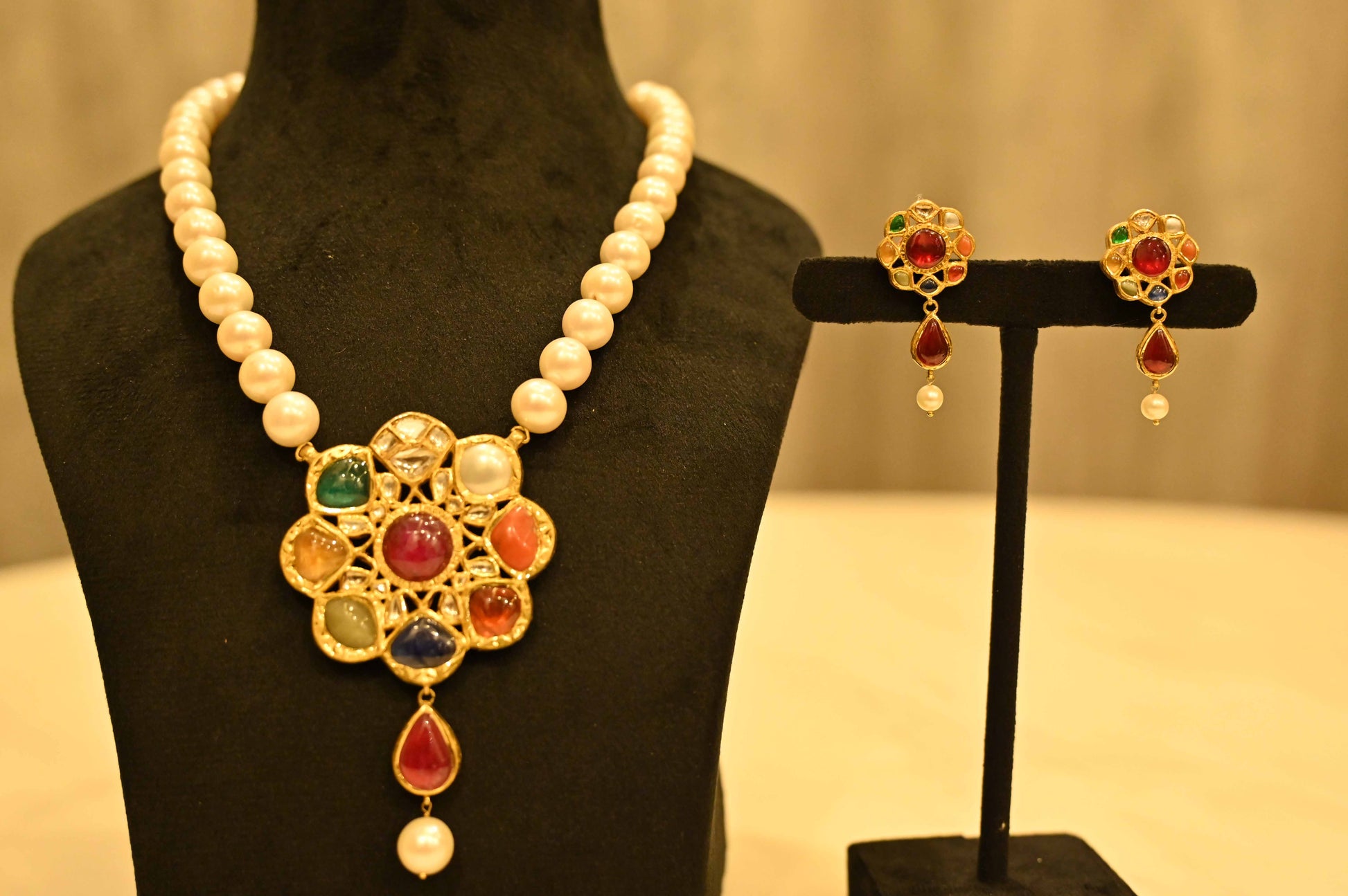 An elaborately handcrafted necklace made in 22K fine gold and uncut diamond polkis, studded with Navratna jewels, natural pearls and Enamel on the back. Comes with a pair of matching earrings