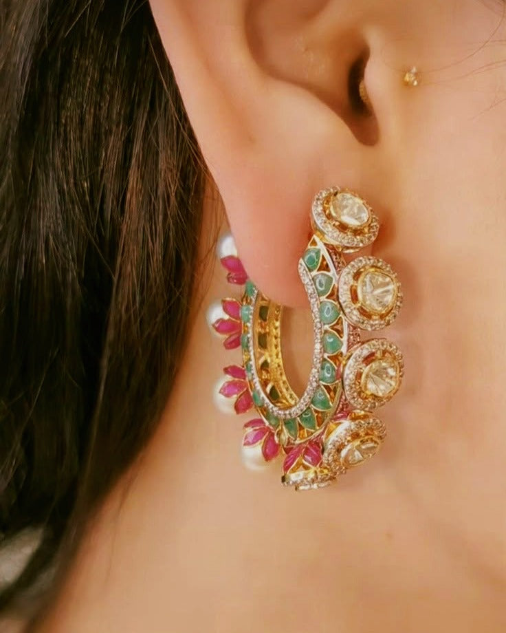 Polki brilliance steals the spotlight – five bold uncut stones like little crowns sitting pretty on your ears.