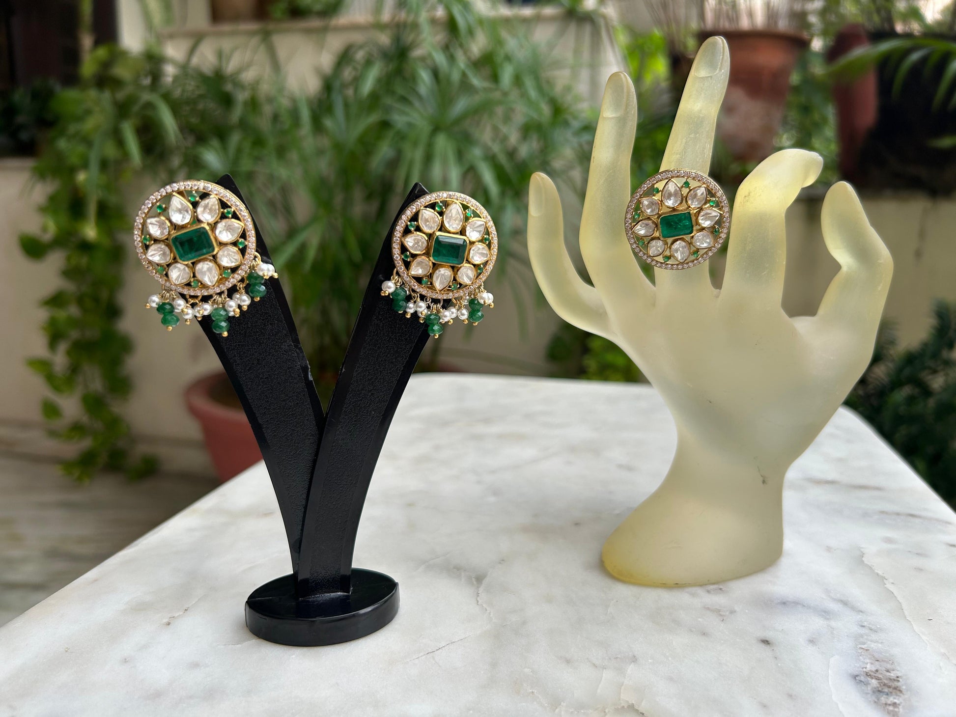 Dangling at the base, clusters of pearls and green beads add a touch of movement, evoking the opulent courtly aesthetics of Mughal queens. Whether paired with rich silks or contemporary couture, the Regalia Studs seamlessly embody both tradition and modern luxury.