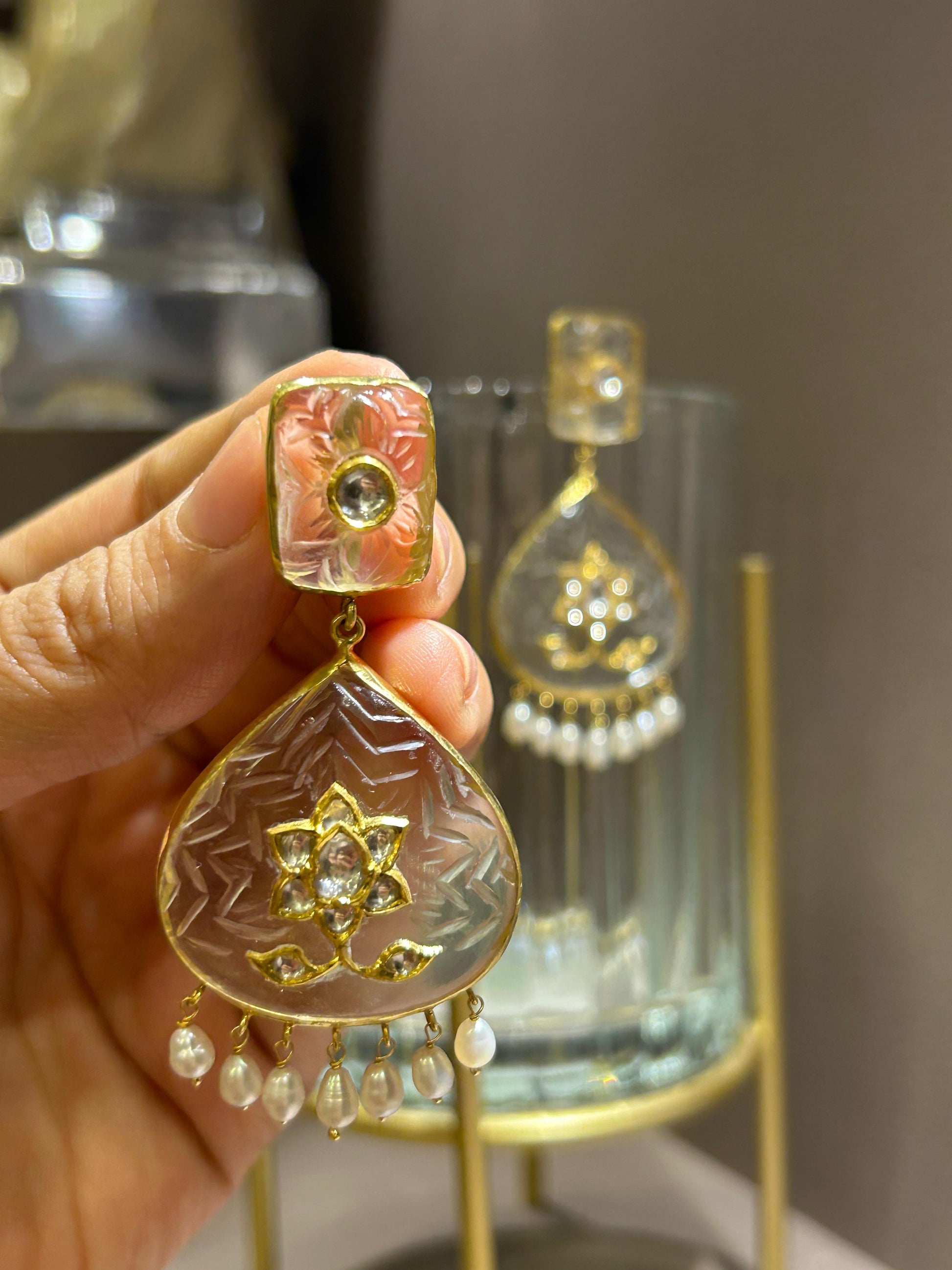 These pink-hued carved earrings bring back the opulence of miniature paintings and palace whispers. Featuring Mughal florals inset with kundan diamonds and strung with a fringe of pearls, the Roshanara Sitara earrings are femininity reborn — radiant, rooted, and resplendent.