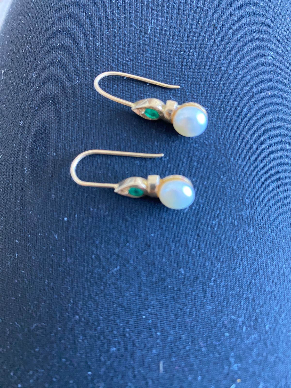 Delicate yet striking, these Emerald & Pearl Drop Earrings are a perfect blend of sophistication and charm. Crafted in 18K gold, they feature lush green emeralds paired with luminous pearls, creating a graceful contrast that exudes understated luxury.