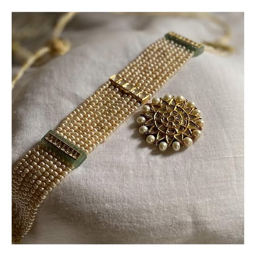 This handcrafted choker features strands of luminous pearls, meticulously strung to form a regal band around the neck. The highlight is a detachable sunburst pendant—crafted in authentic Kundan technique—surrounded by a constellation of pearls, reflecting the radiance of a night sky ruled by a single, dazzling star. Jade enamel accents and antique gold detailing lend it that unmistakable Mughal refinement.