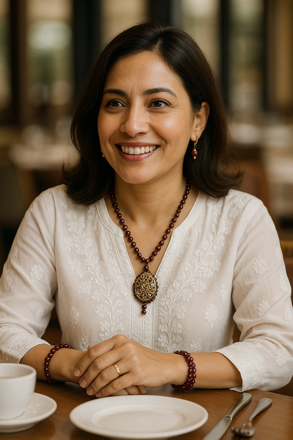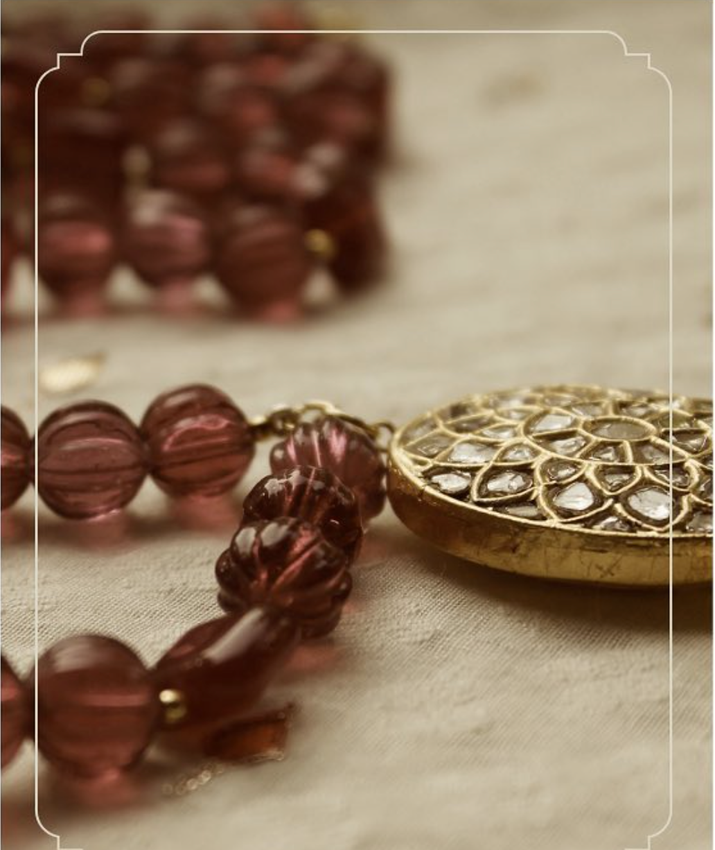 The ornate gold filigree echoes the craftsmanship of imperial courts, while the pendant is luxuriously strung in deep wine-toned semi-precious beads, lending it a richness that feels regal yet effortless. Perfect for the woman who doesn’t need an occasion to flaunt heritage — her presence is the occasion.