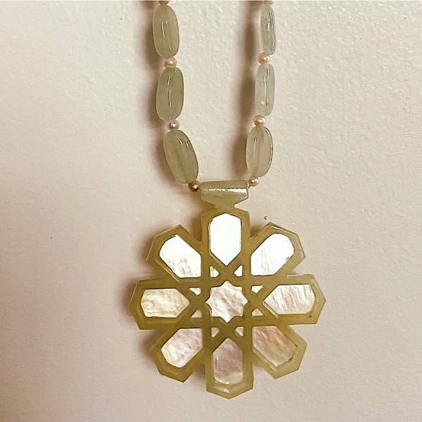 Inspired by the intricate jali windows of ancient palaces, this pendant captures regal geometry in a soft green Aventurine frame inlaid with glowing mother-of-pearl. Paired with Aventurine beads and freshwater pearls, it's a modern heirloom that reflects grace, heritage, and effortless style.