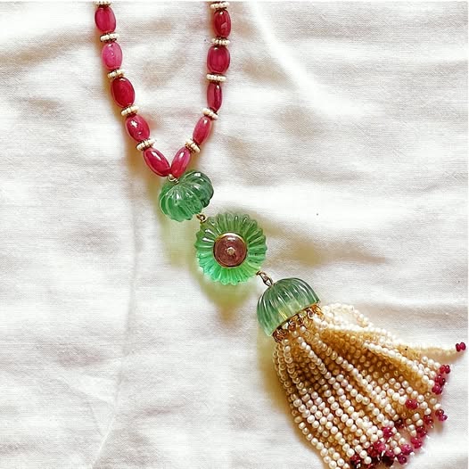 – Hand-carved green fluorite and pink tourmaline-inspired beads paired with Mughal-style melon-cut stones