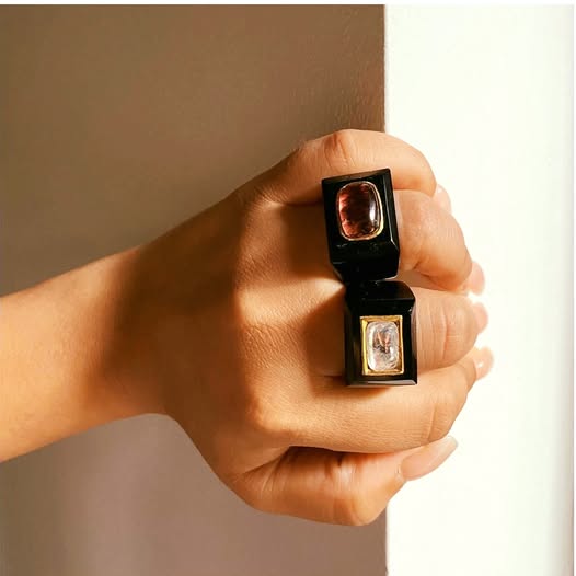 Meet the showstopper from our Mughal Chic collection — a dual-stone geometric ring that blends the boldness of modern architecture with the soft glimmer of Mughal royalty. This is not your delicate little accessory. This is jewellery with a point of view.