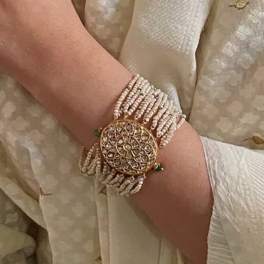 At the heart lies a radiant floral motif, handcrafted in traditional kundan setting with intricate detailing — a true nod to heritage craftsmanship. The strands of pearls gently embrace the wrist, offering both drama and delicacy in one unforgettable piece.