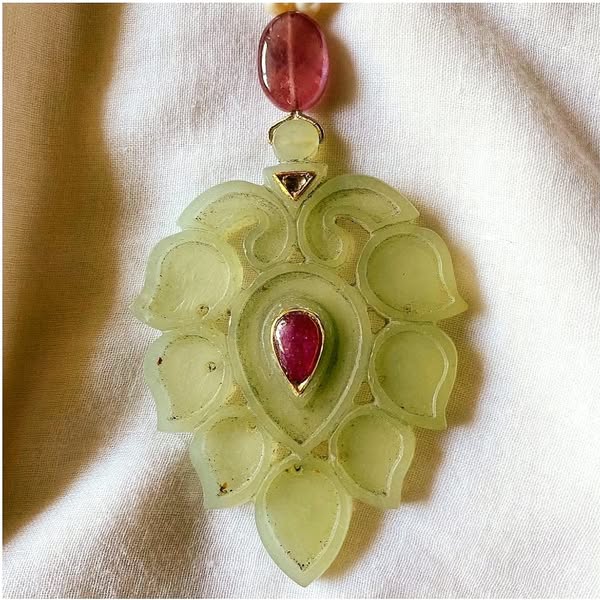 – Carved natural green jade leaf motif, inspired by Mughal garden aesthetics