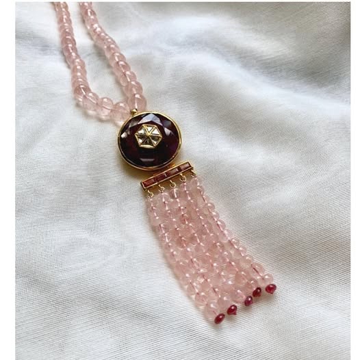 Blushing hues meet regal finesse in the Zahira Tassel Necklace, a masterpiece from GoldSutra’s Mughal Chic Collection. Crafted with delicate rose-toned beads and a bold central medallion adorned with Mughal-inspired geometry, this necklace speaks of grace wrapped in strength. The flowing tassel strands add movement and charm, making it a versatile piece for both celebrations and moments of quiet confidence.