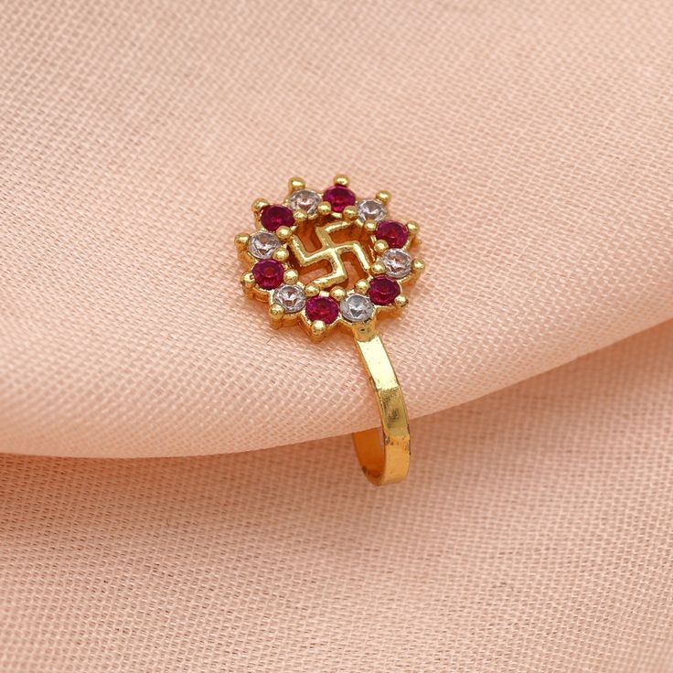 Gold-plated nosepin with Swastik | Temple wear nose pin in gold | 925 silver base nose ring with ruby | Ethnic nosepin for pooja | Indian nose jewellery for GenZ